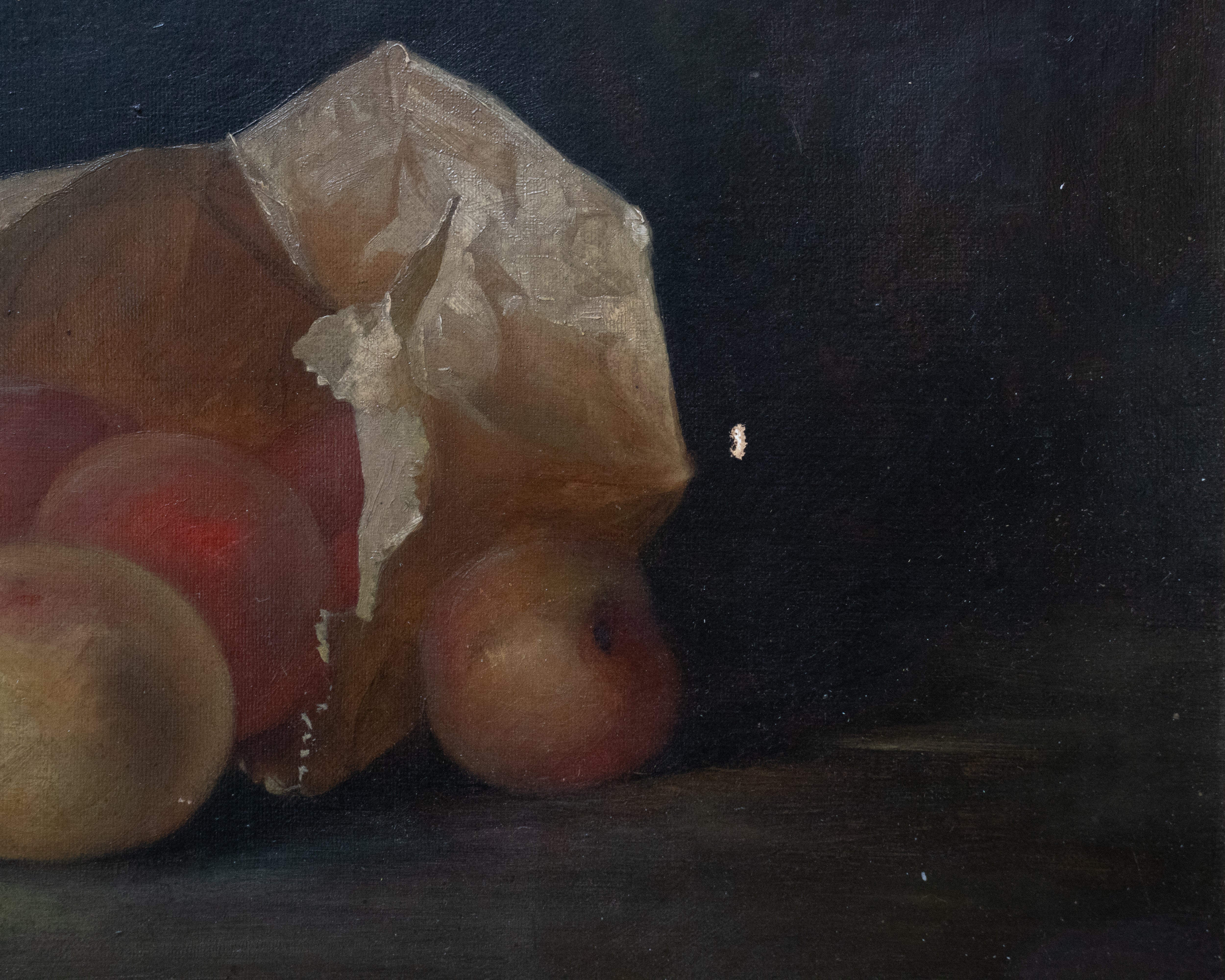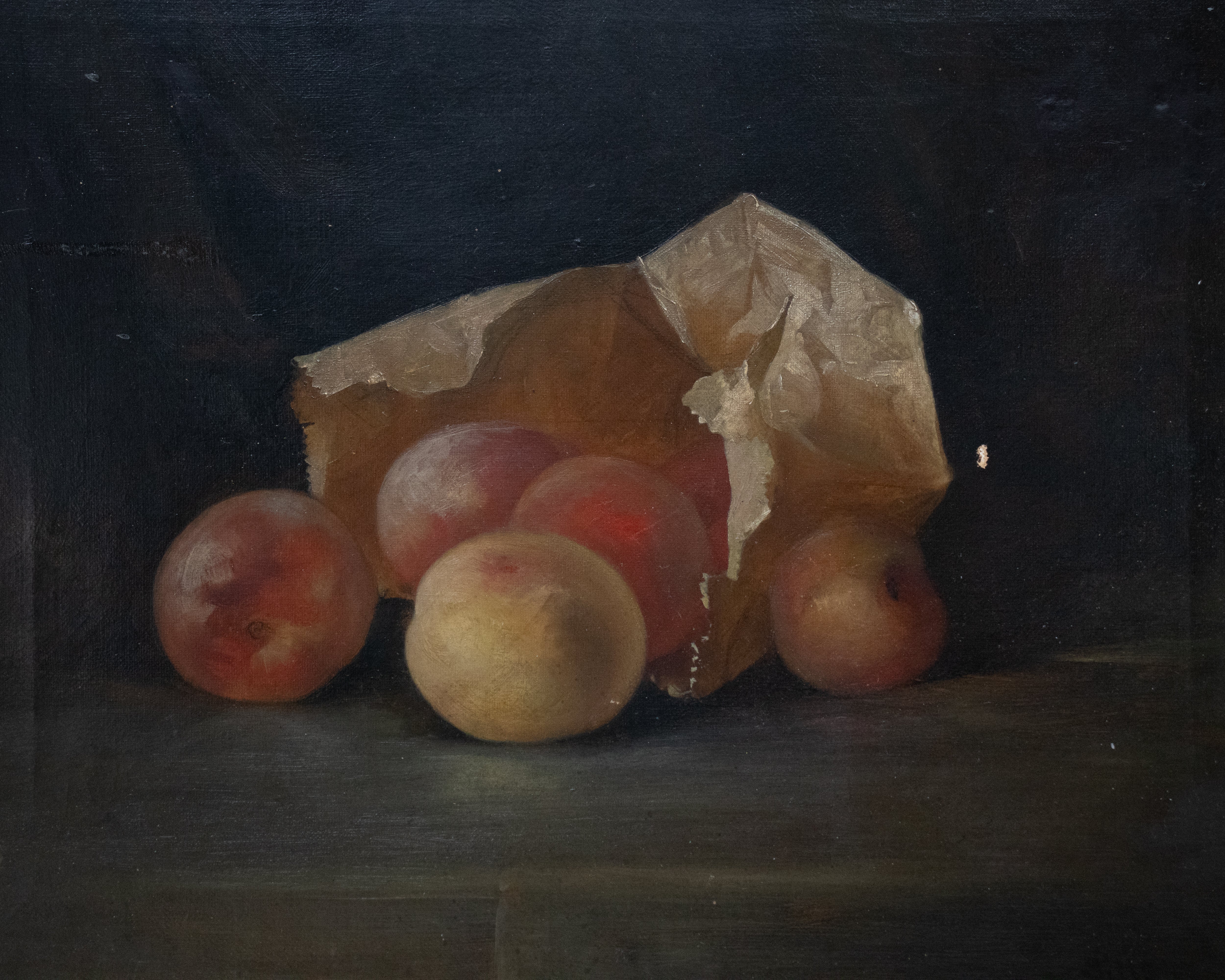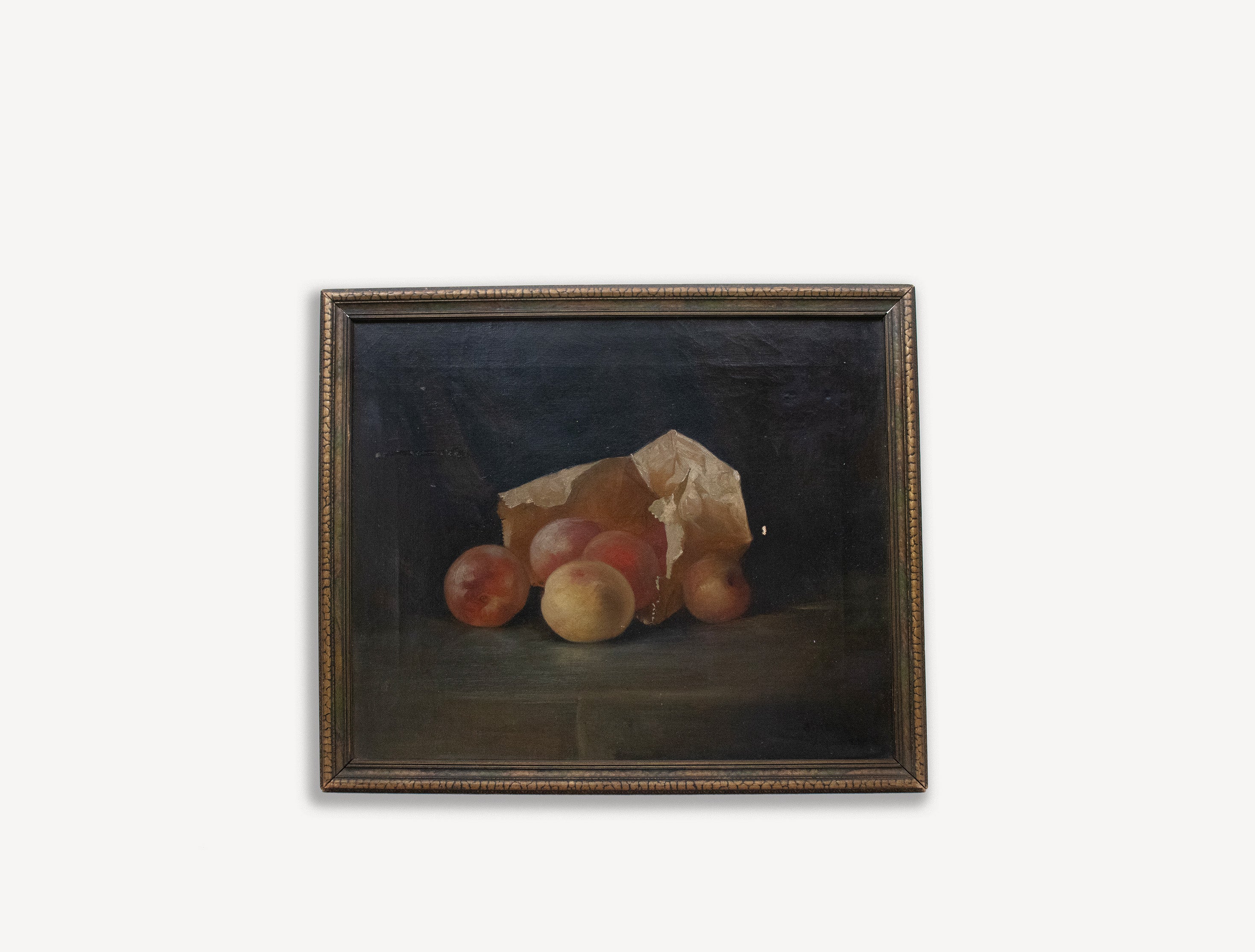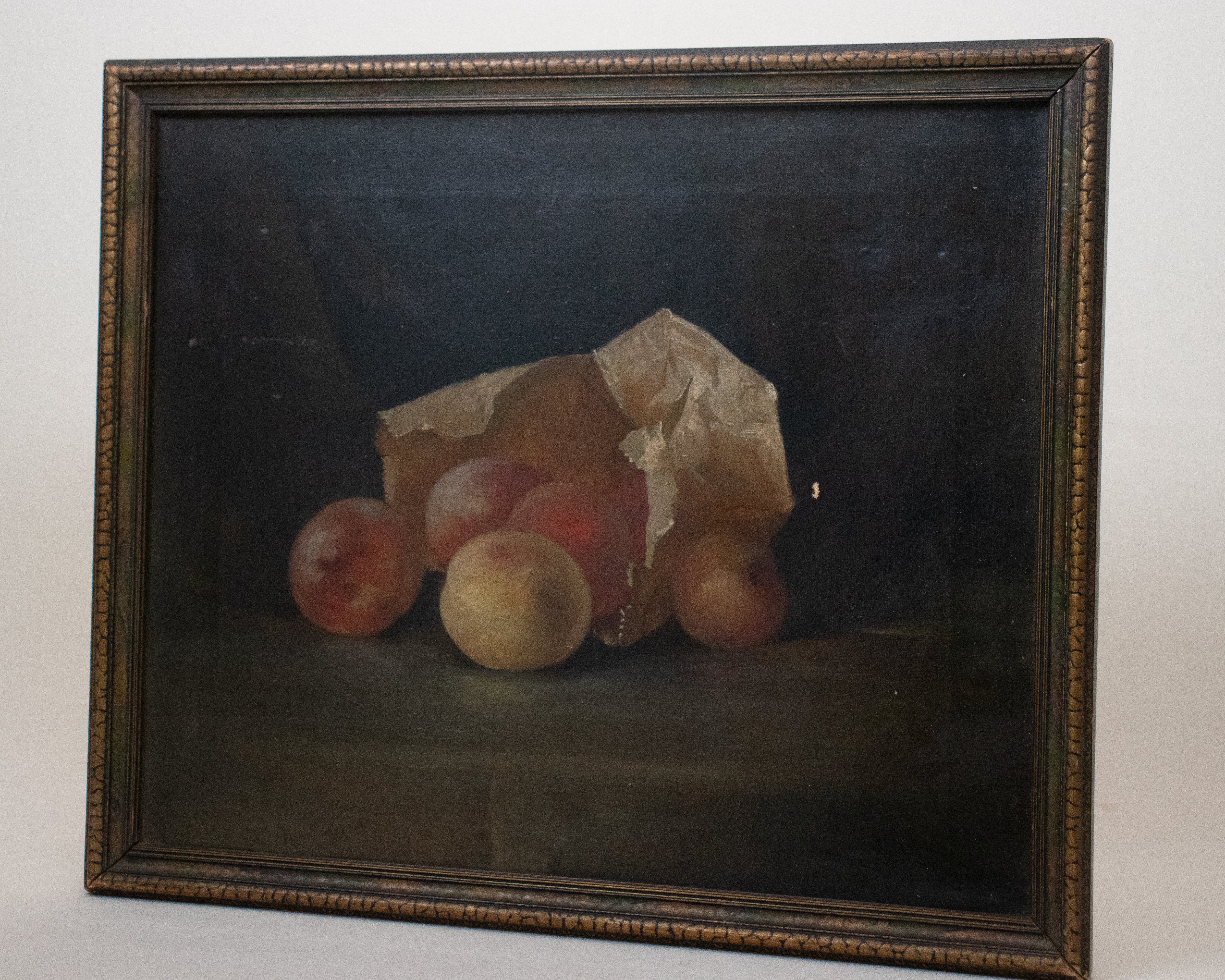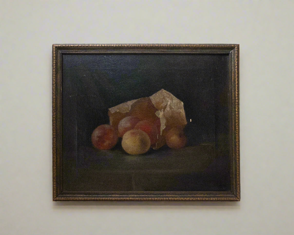 Description: Unsigned Still Life Oil Painting of peaches in a paper bag. Beautiful, moody color palette with light patina.