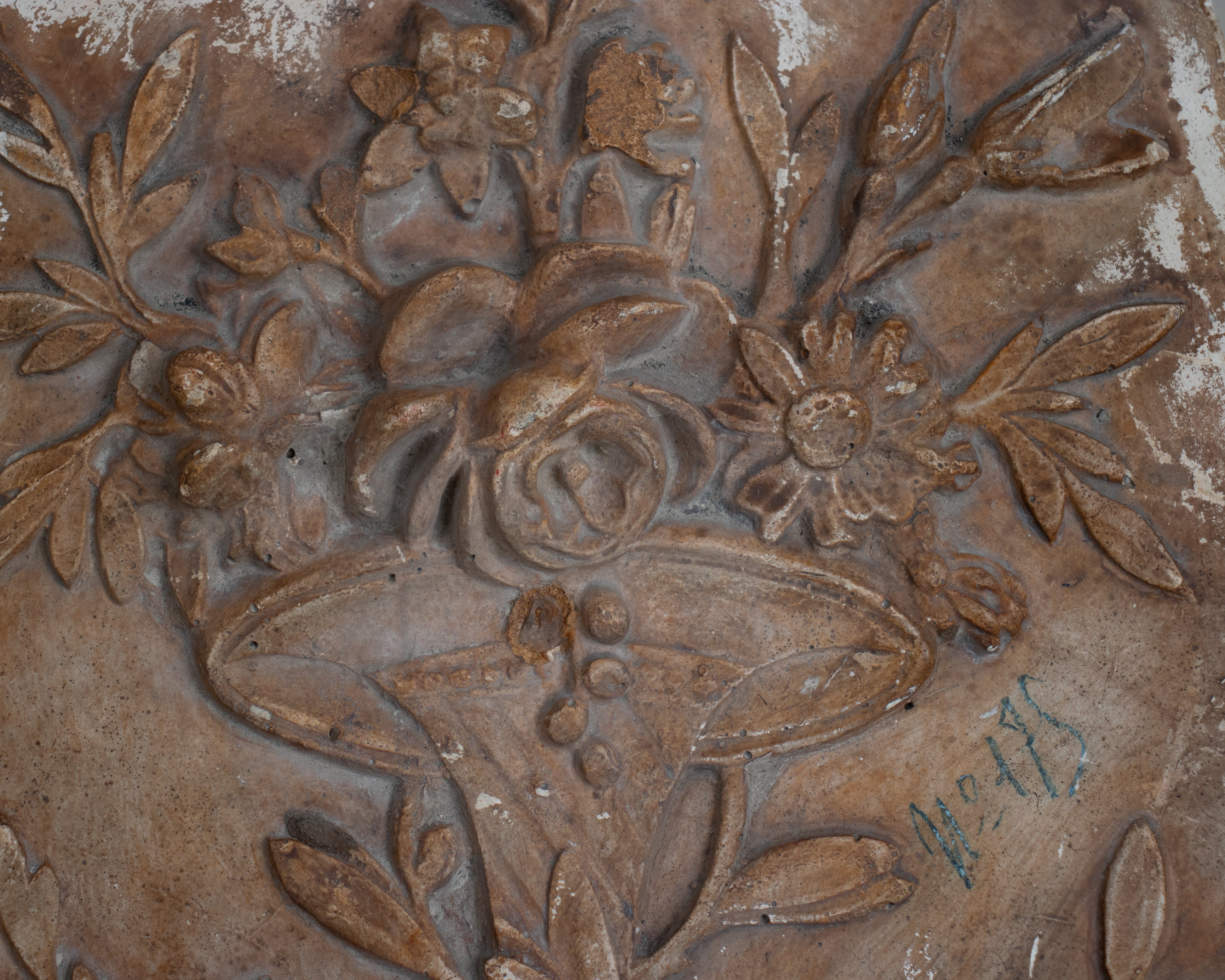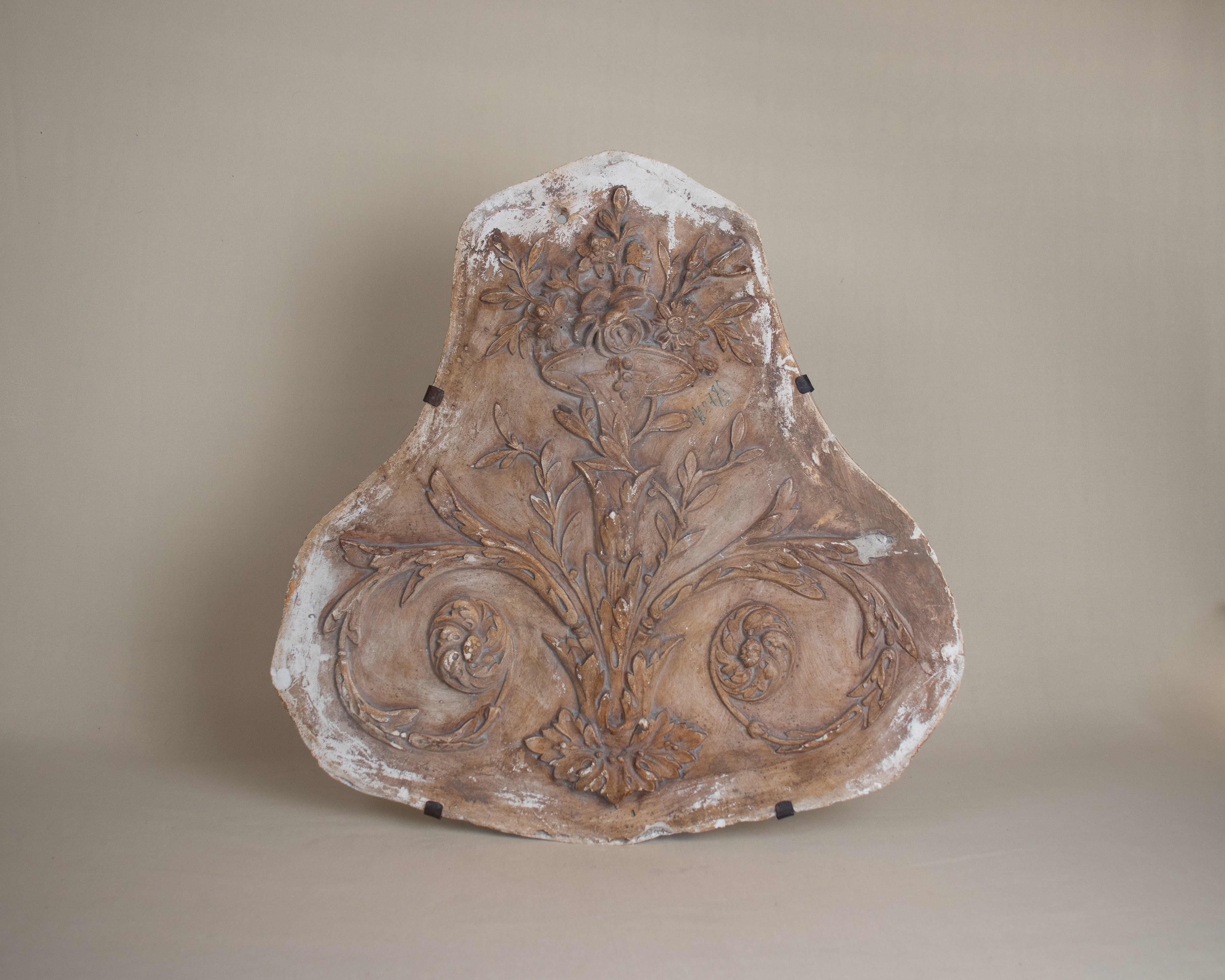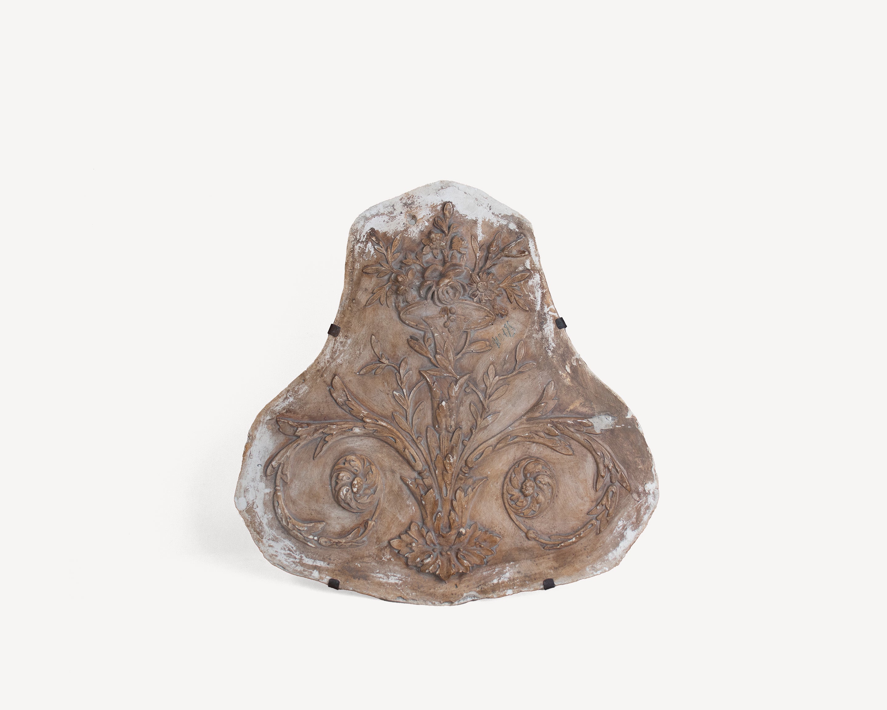 Description: Antique French Molded wall Plaque with floral design. Includes hanging mechanism on the back of plaque.