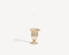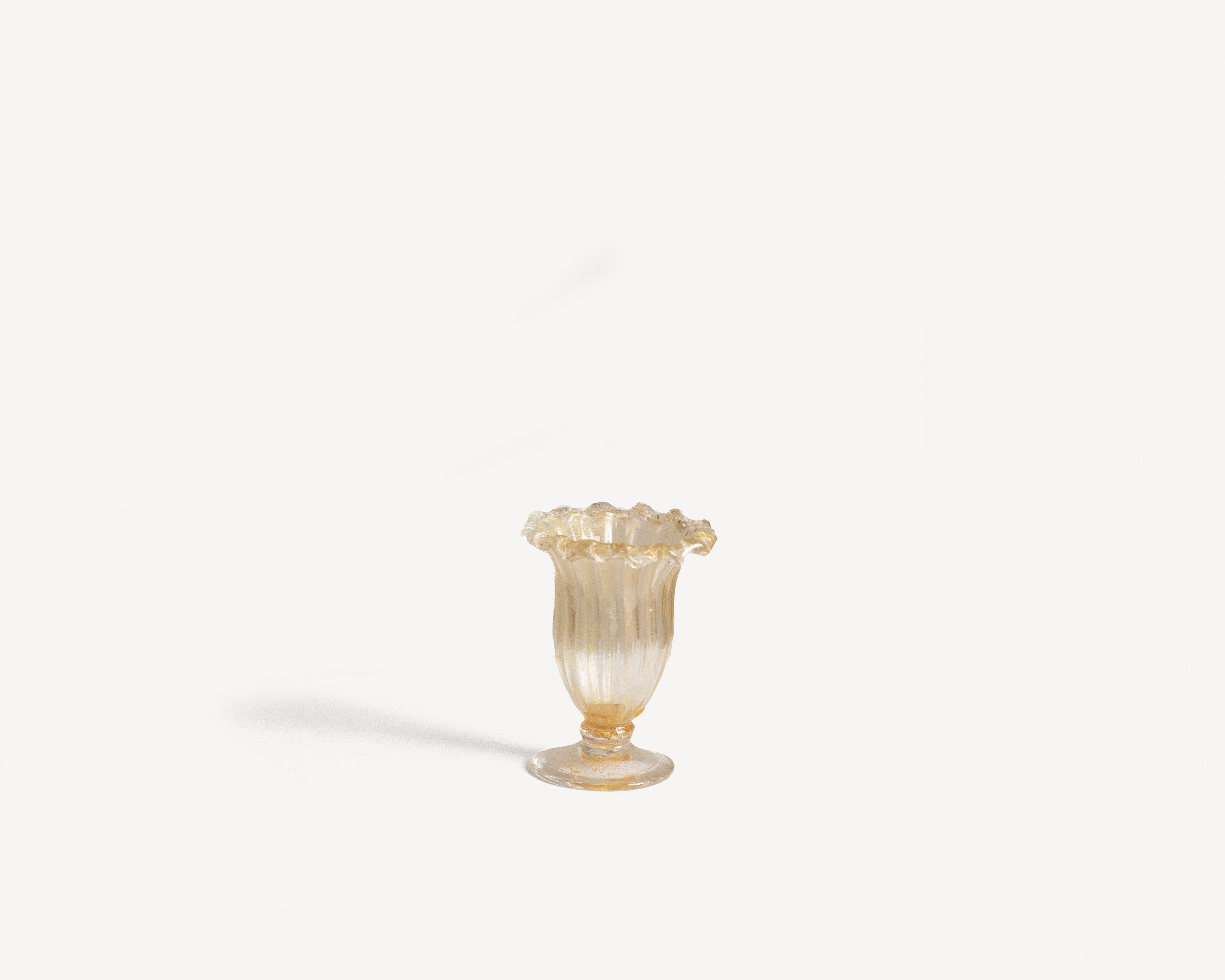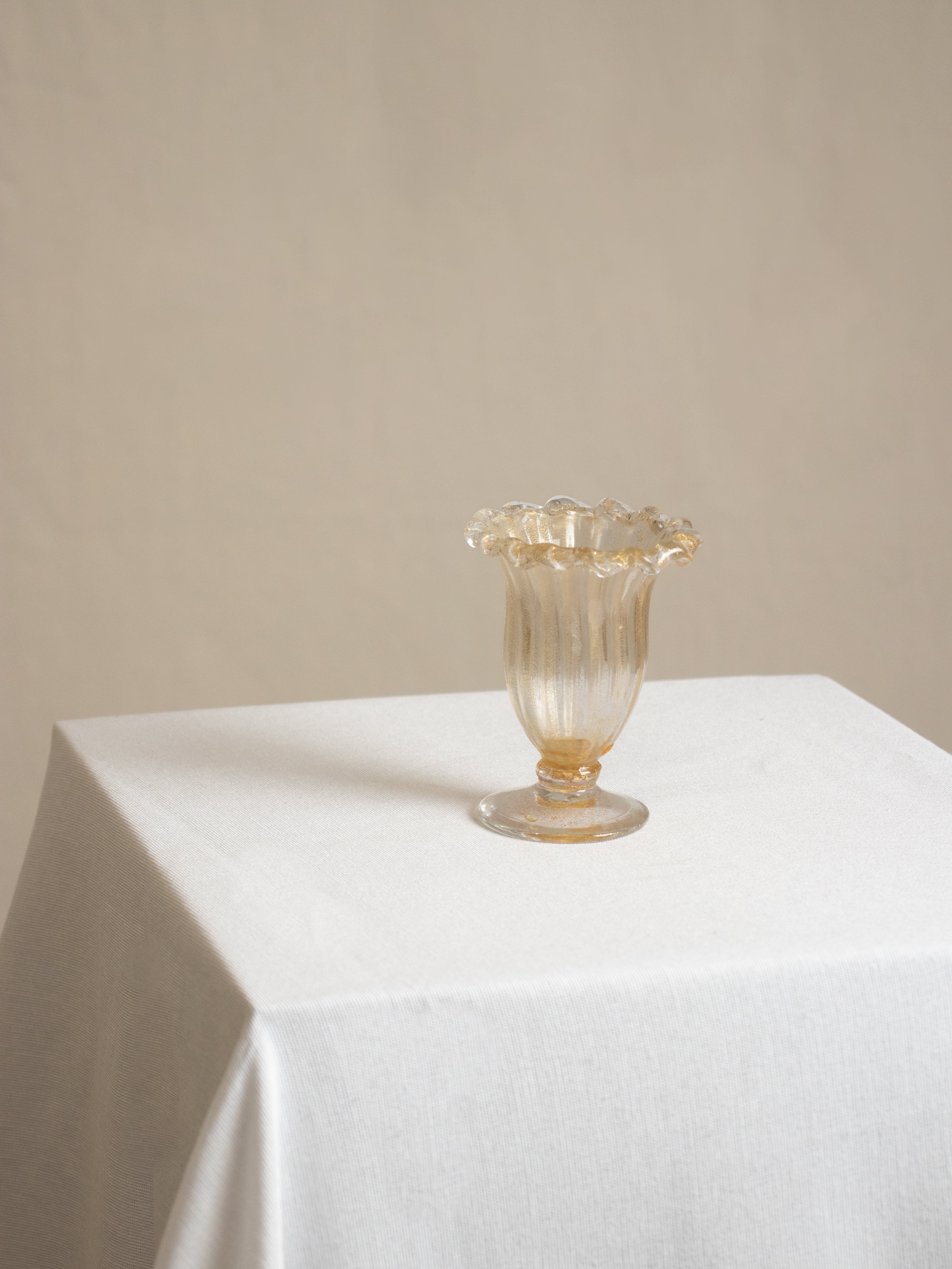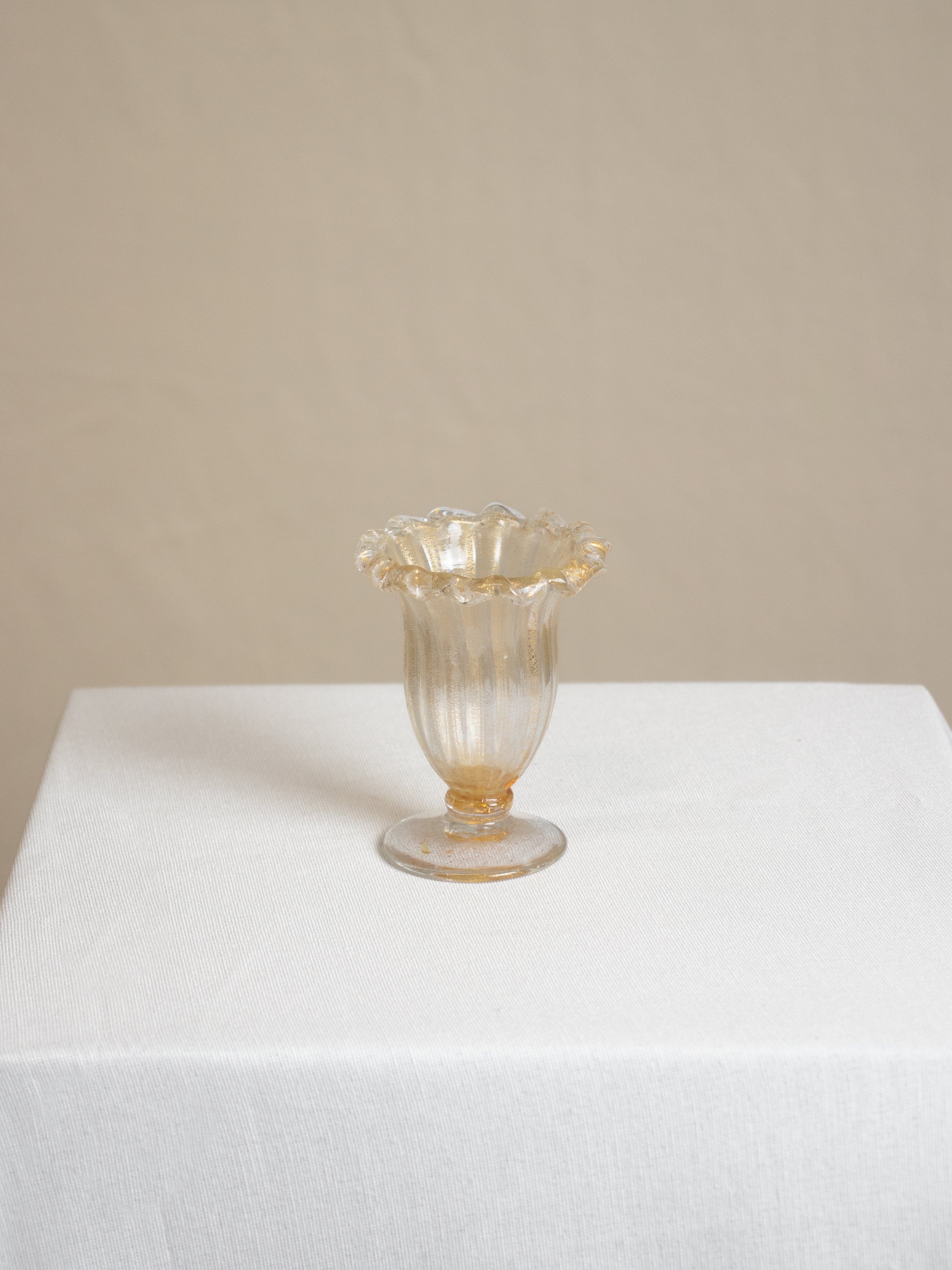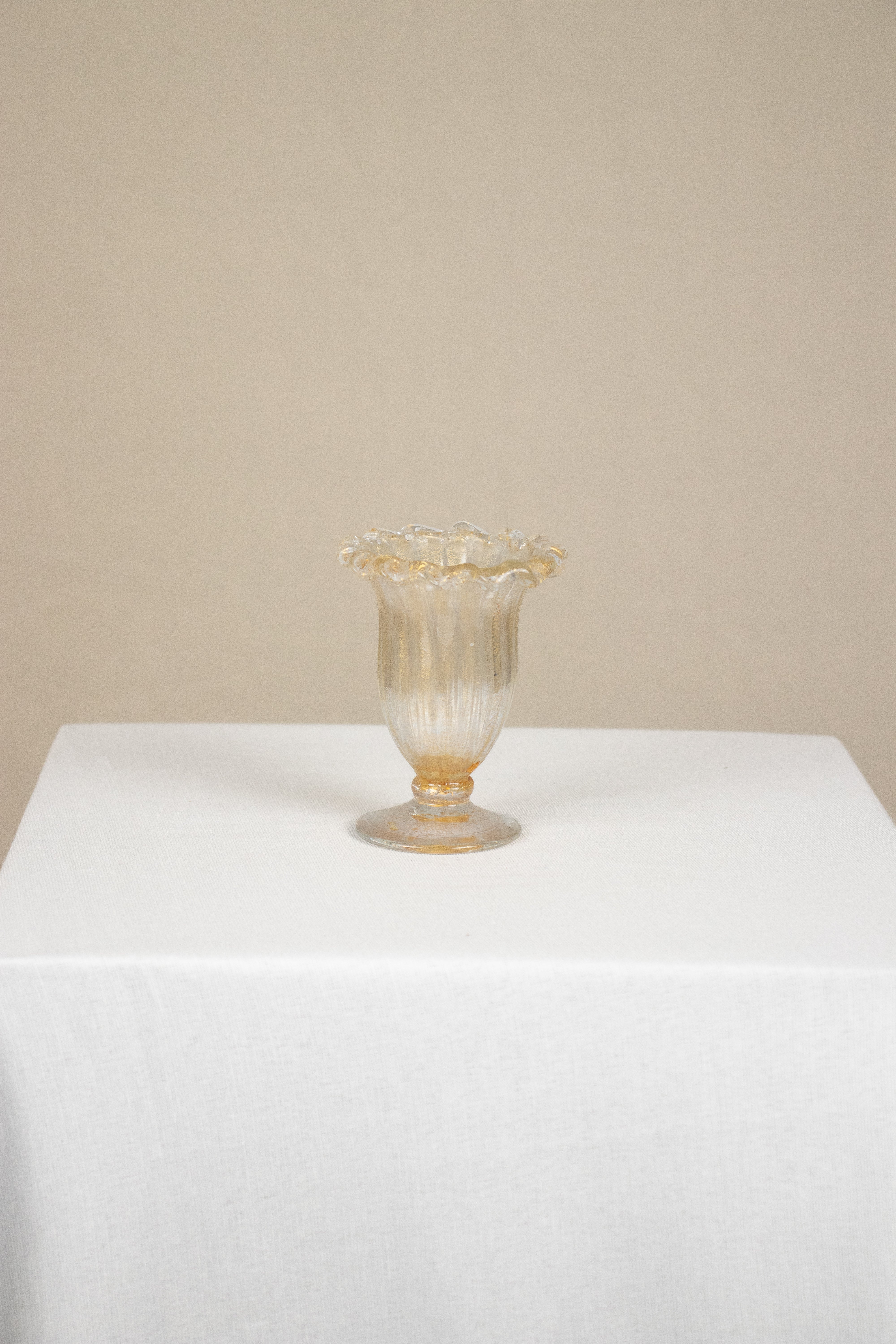 Description: Vintage Murano-Style Bud Vase adorned with a ruffled rim and avventurina gold flecks. These can also be used as a tasting glass or shooter. There are four available and are sold individually.