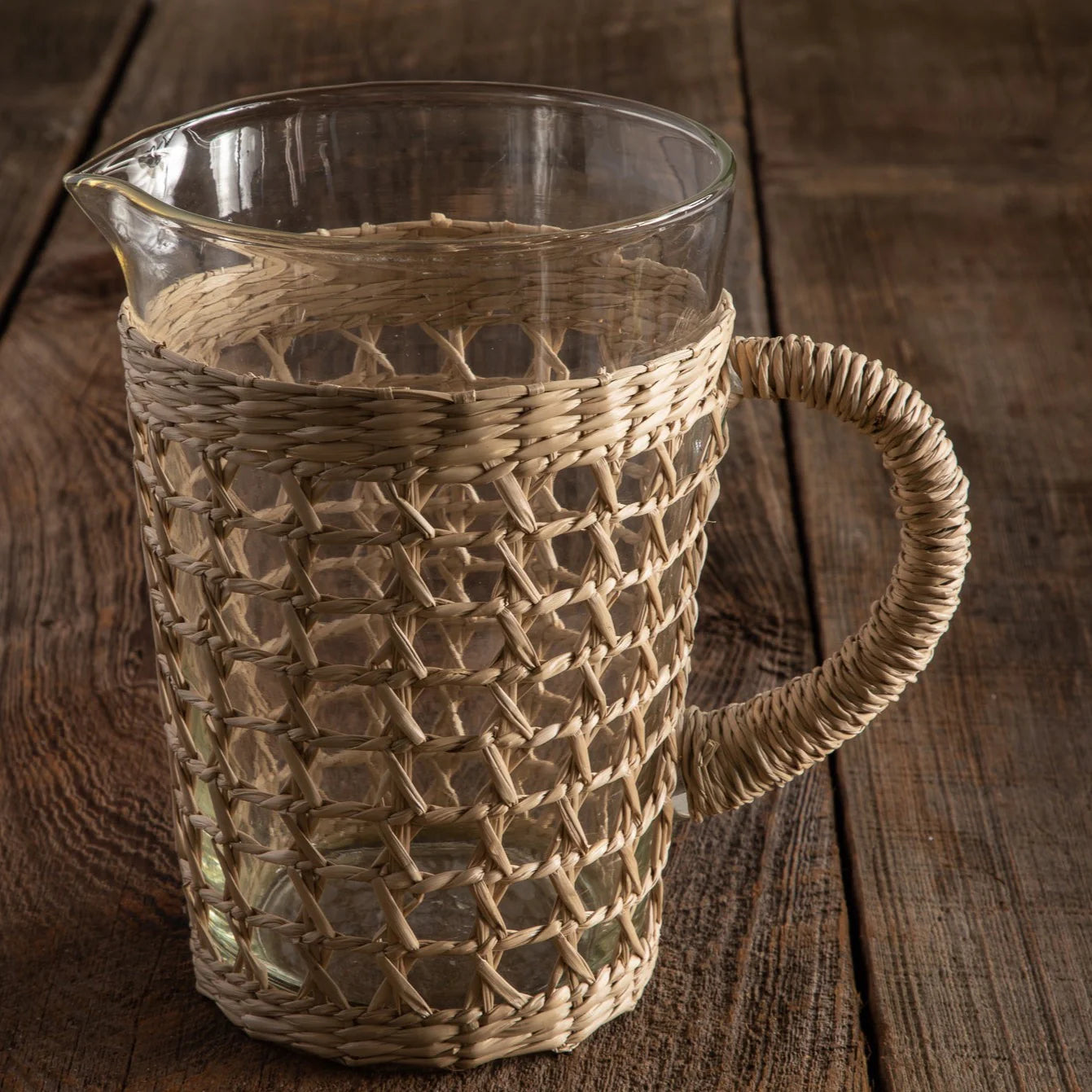 Bring the beauty of nature into your home with this handcrafted seagrass pitcher. The natural fibers create a warm, earthy look while the sleek glass body keeps it looking polished. Whether you're hosting a backyard barbecue or a cozy dinner party, your guests will be impressed by this stunning piece.