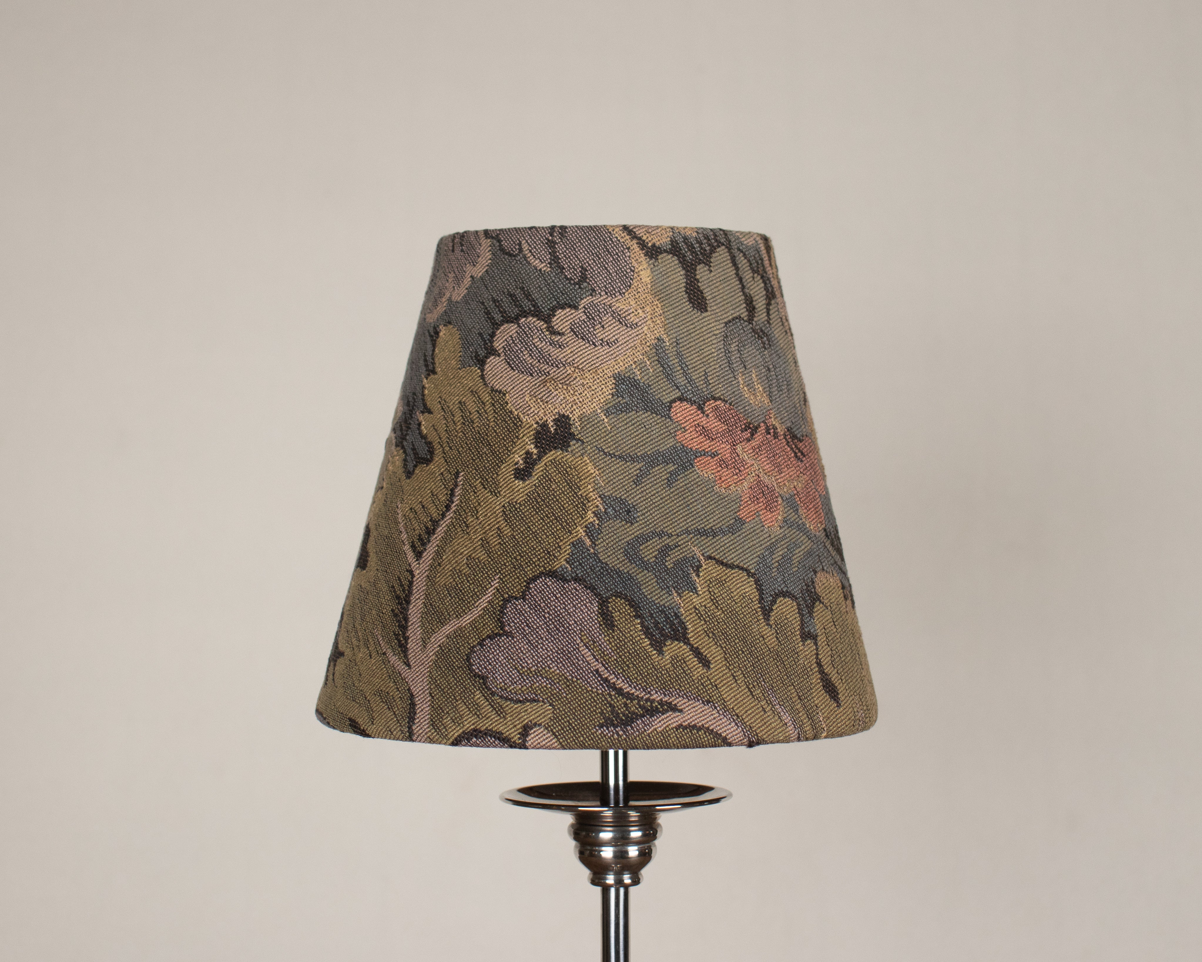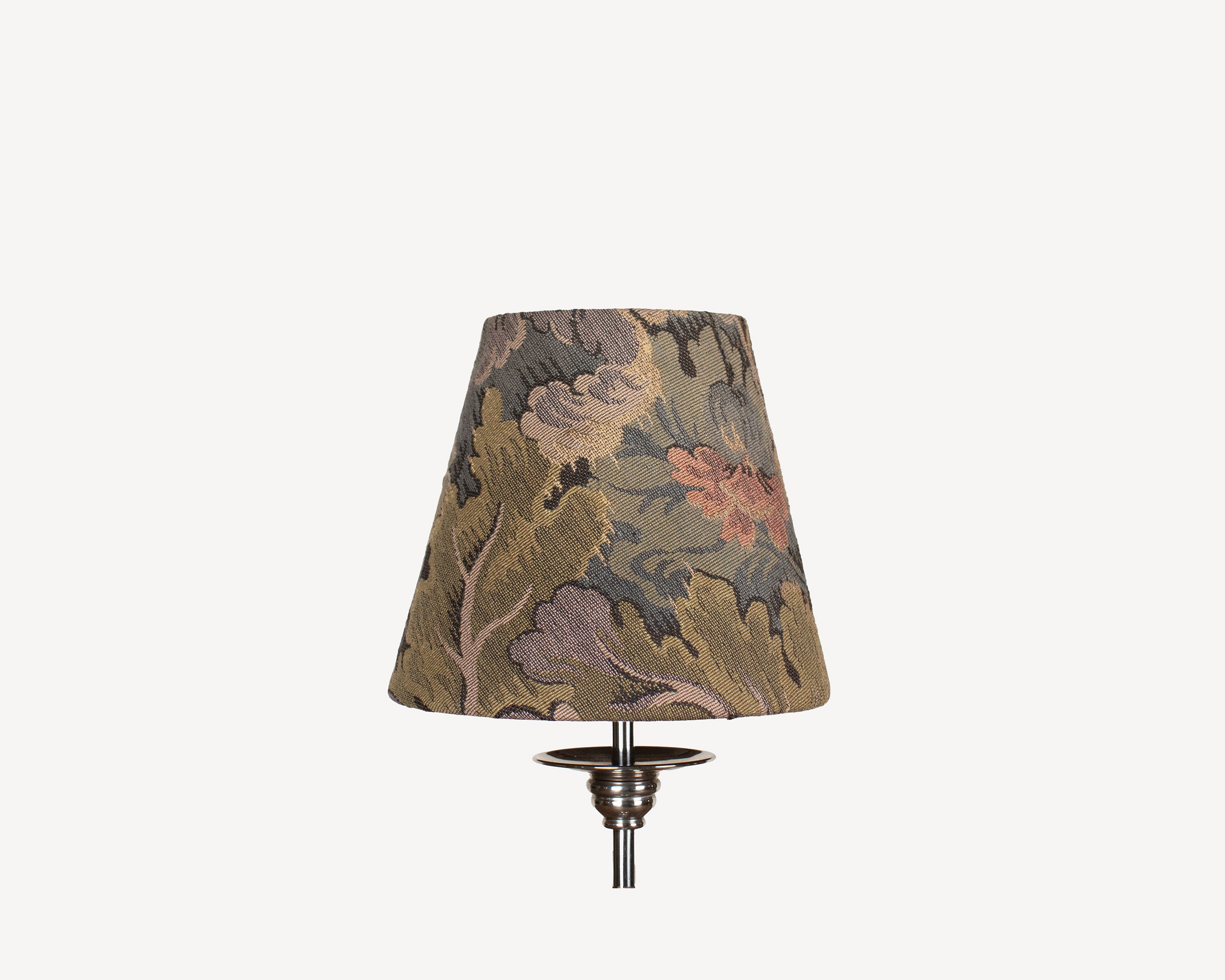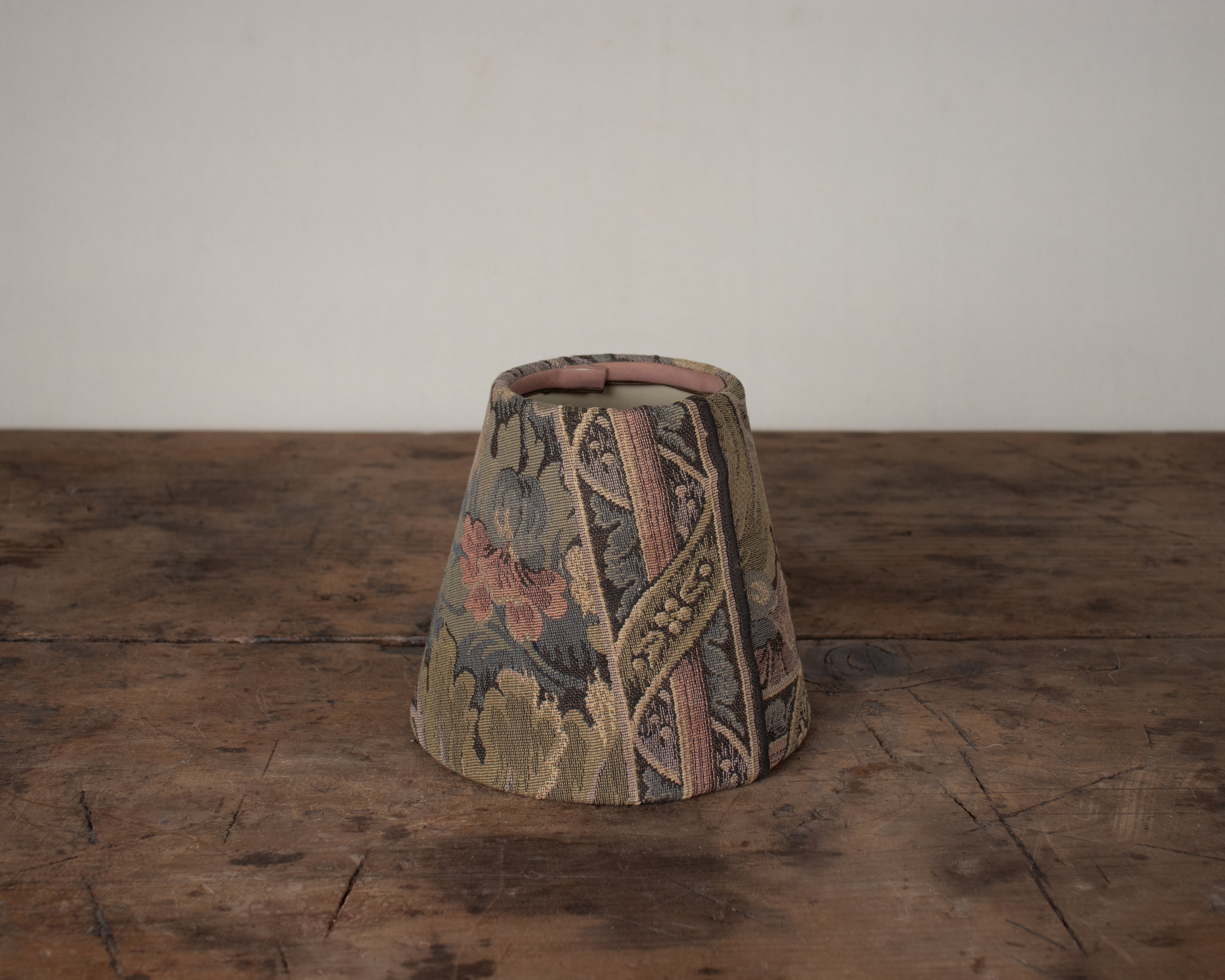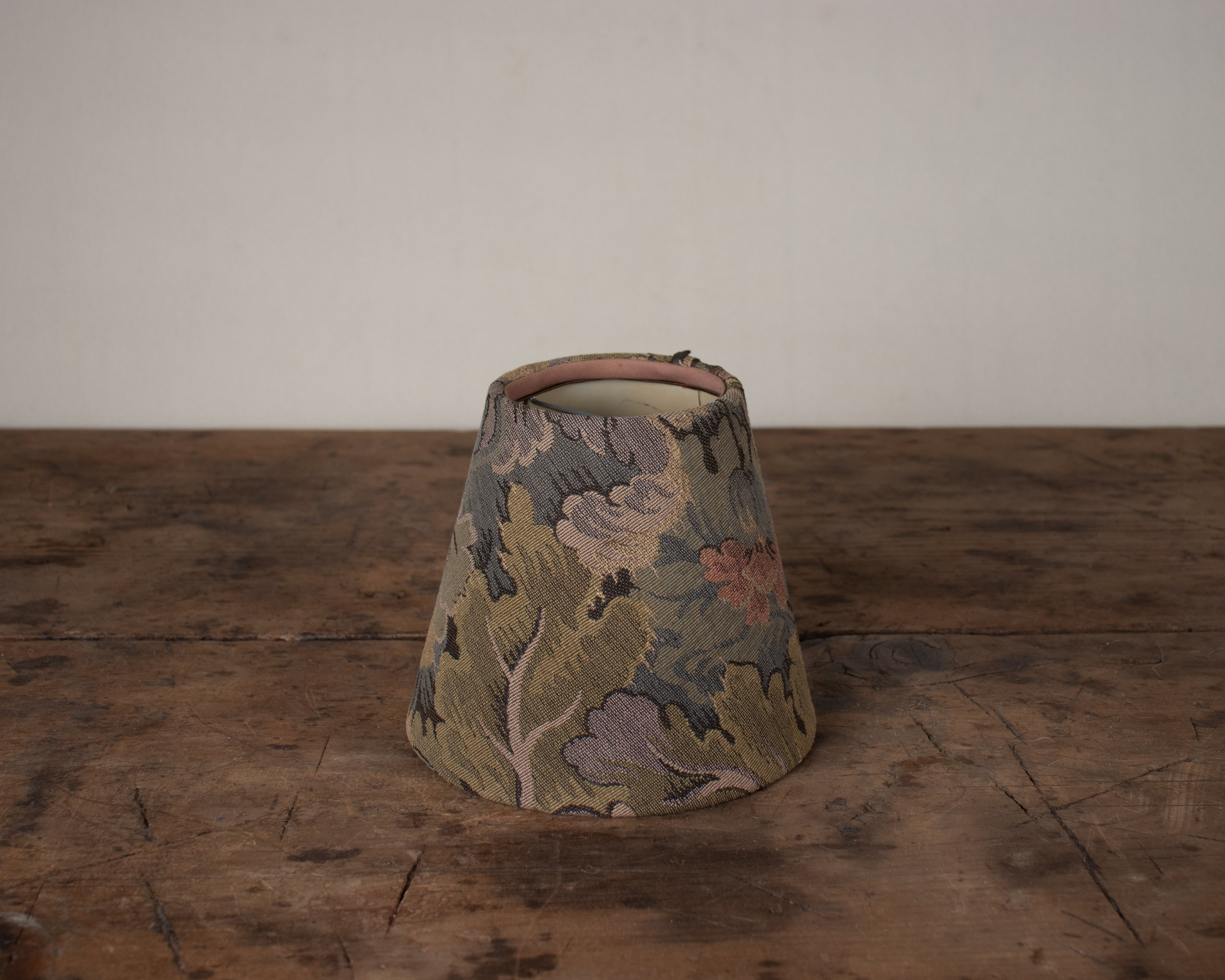 Description: Petite Vintage Lampshade made from 18th Century French Verdure Tapestry. Features foliage design and dusty pink piping on interior. Discreet Edison Clip-on Hardware makes this shade suitable for any number of fixtures.