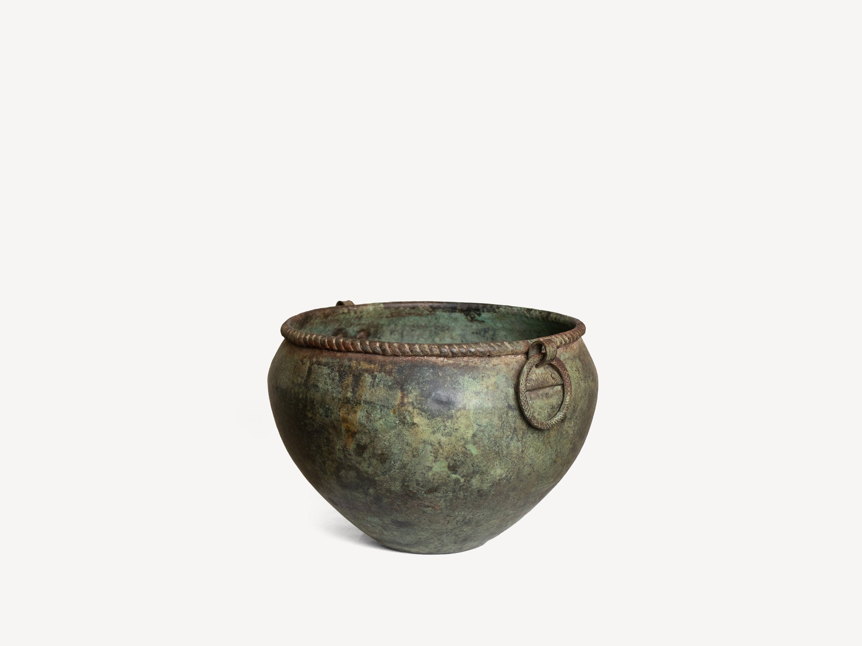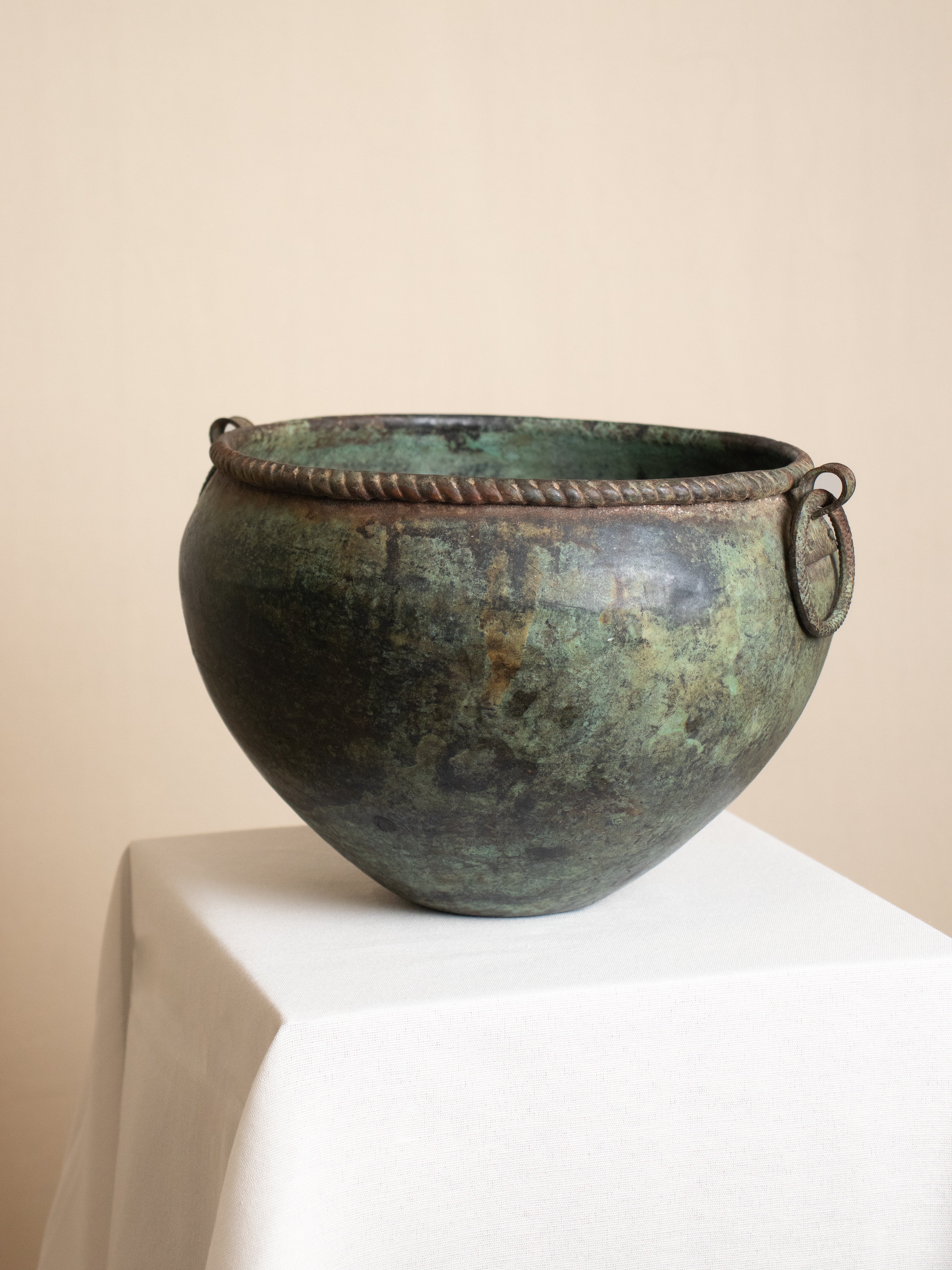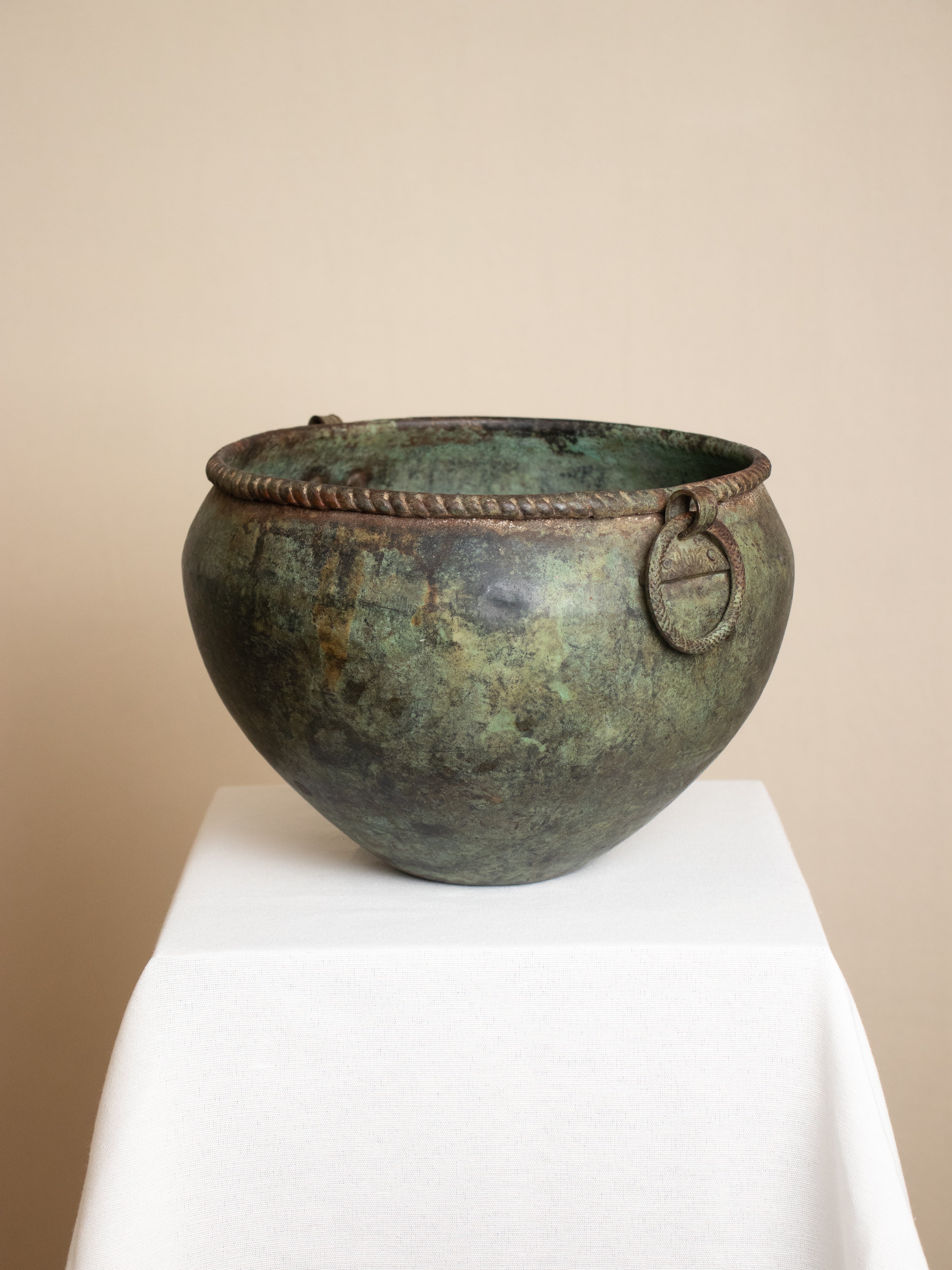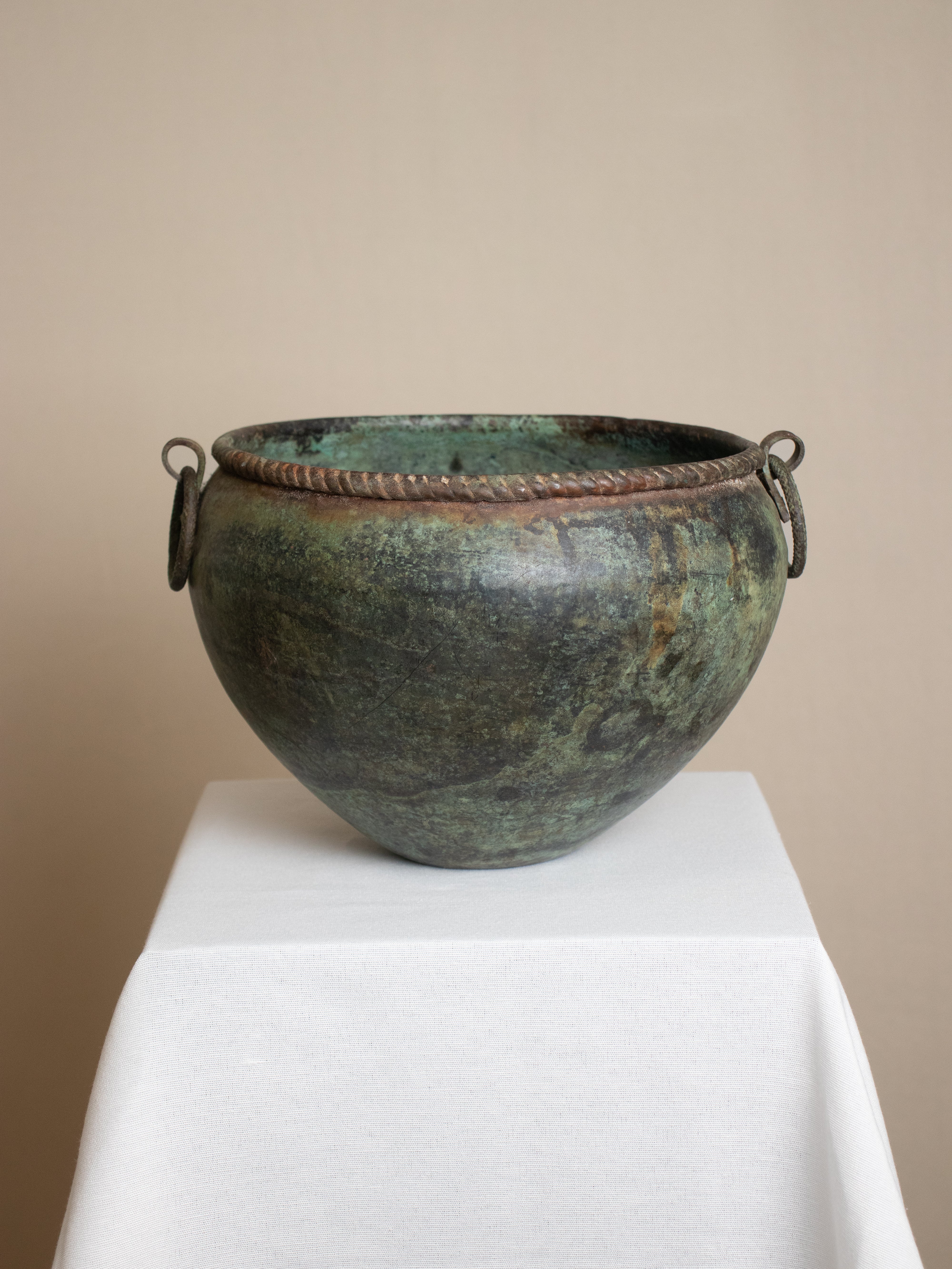 Description: Middle Eastern Copper Cauldron with decorative border and handles. Rich patina deepens its character and charm.