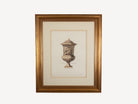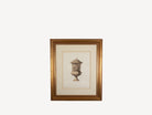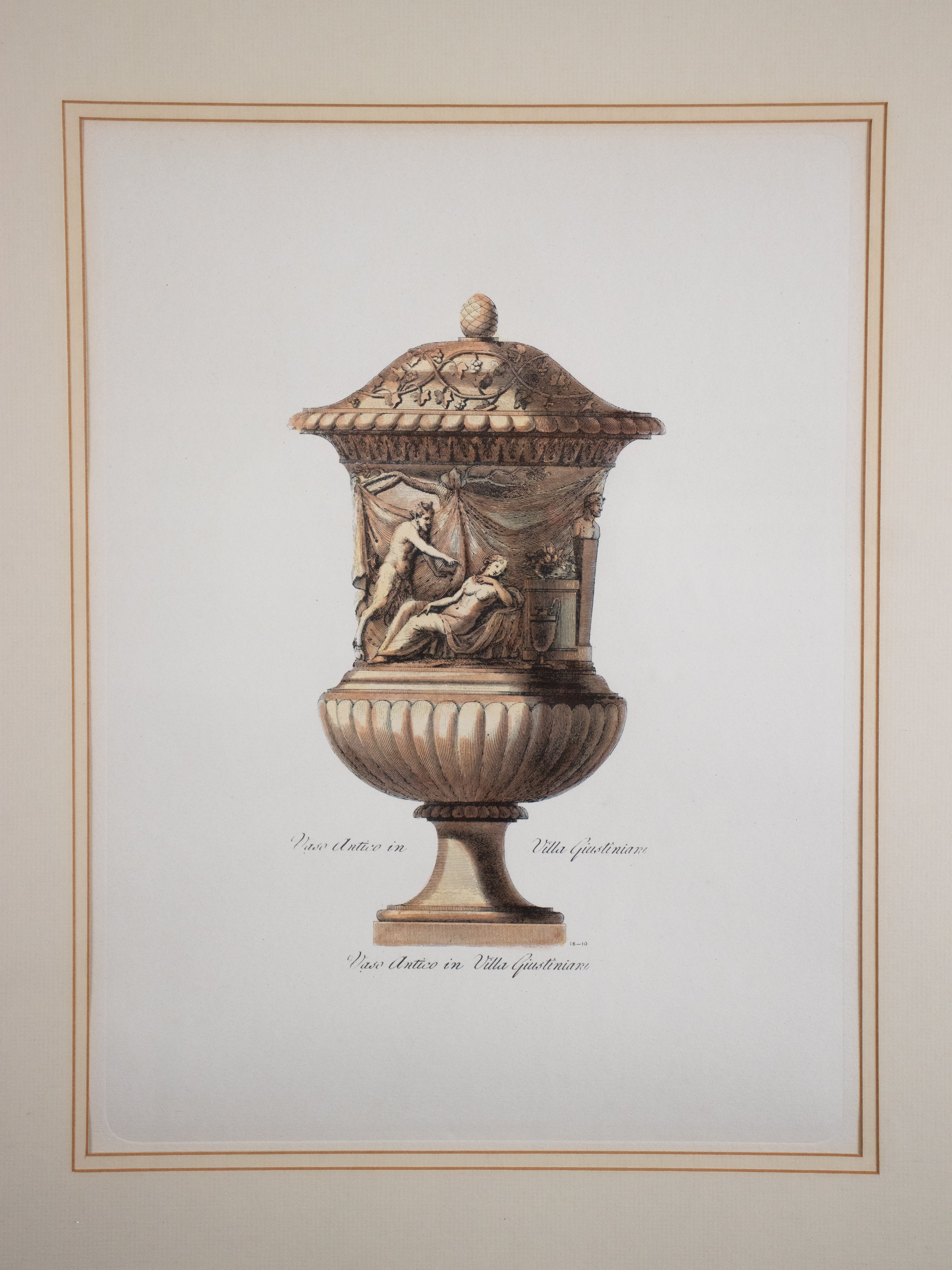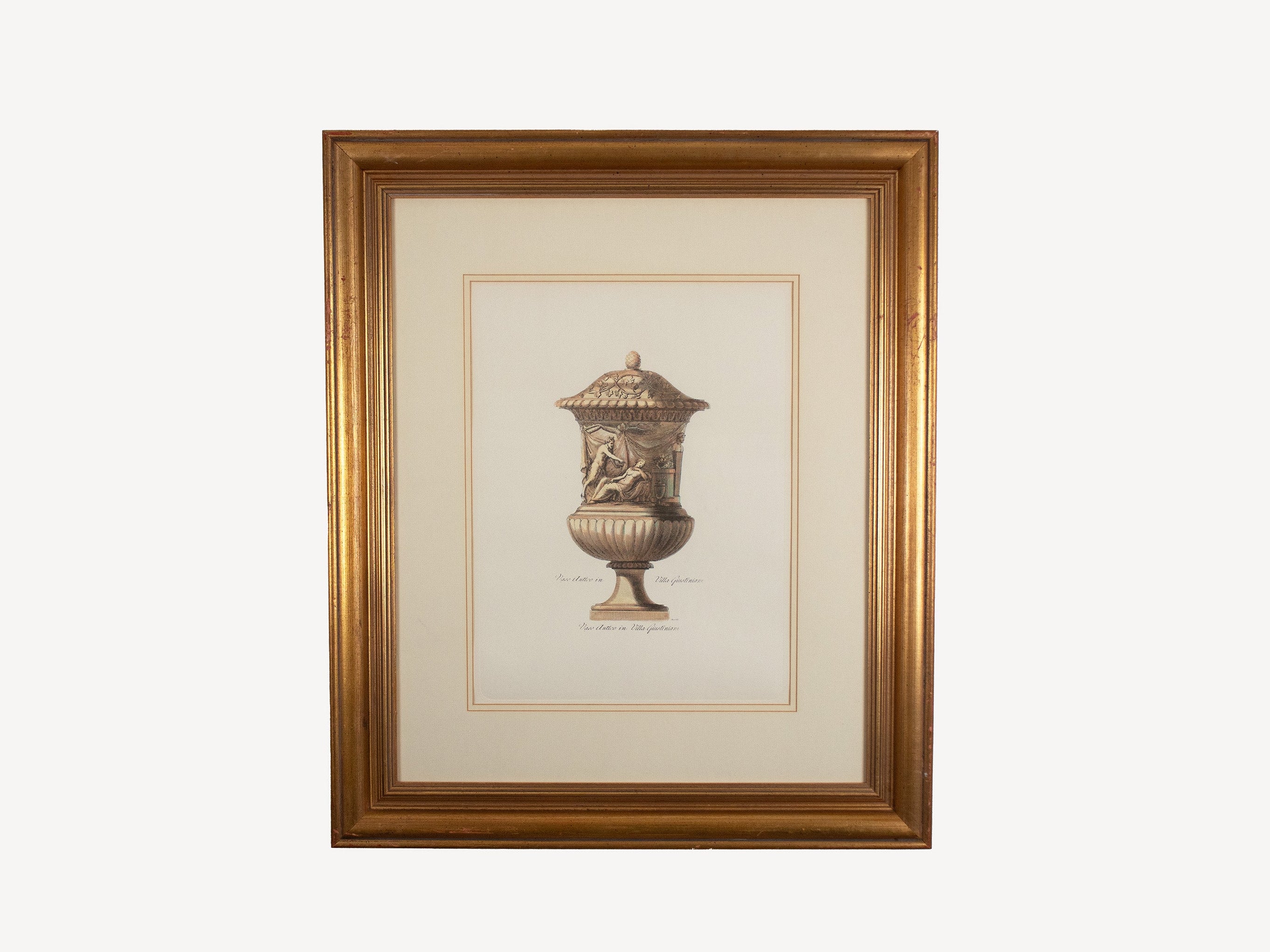 Description: This is one of three large framed etchings featuring classical urns in the style of Giovanni Battista Piranesi. Each of the three prints depicts a Vaso Antico and inscriptions noting the collection. Preserved in a solid wood frame with hanging mechanism attached.