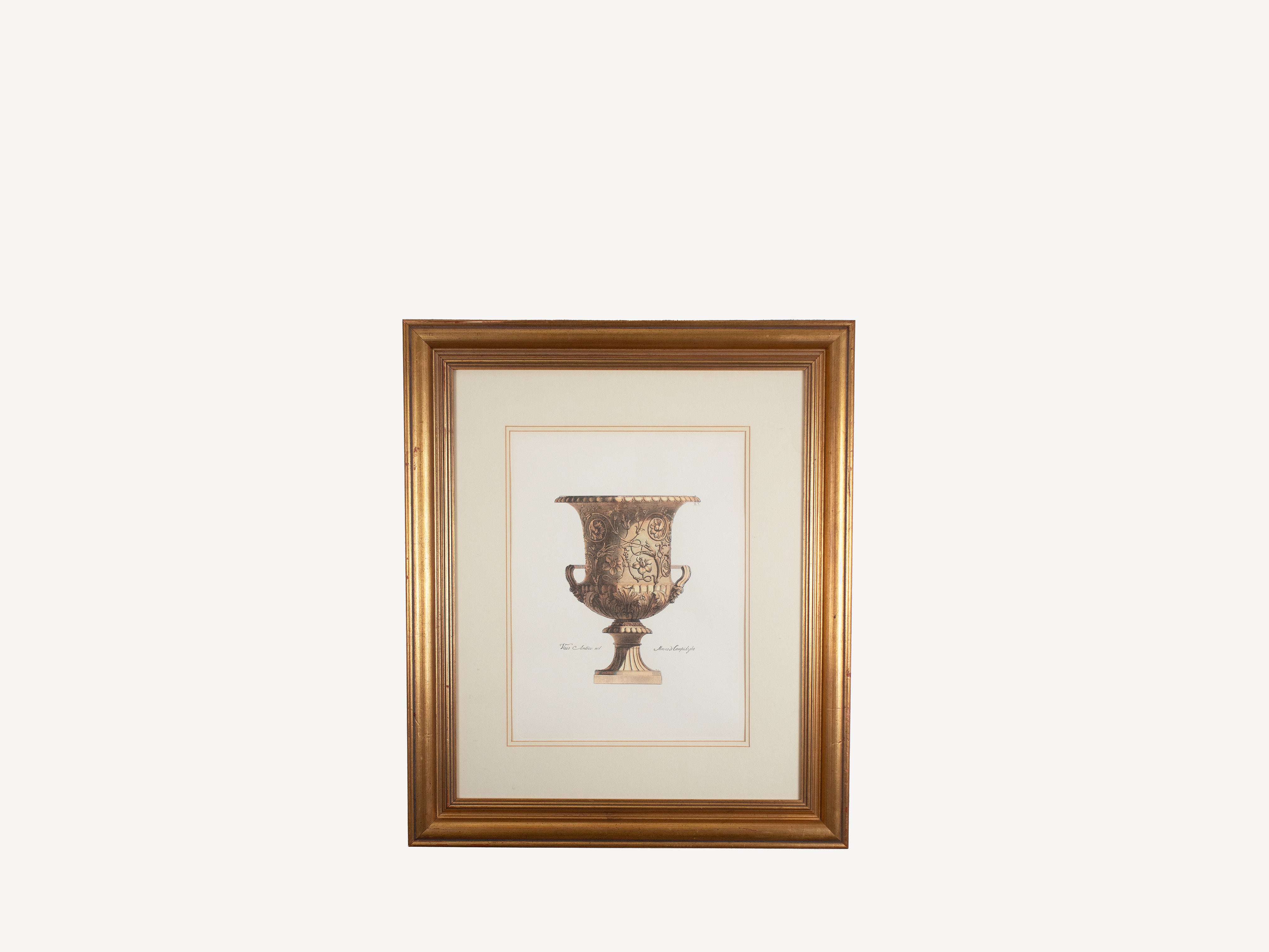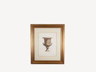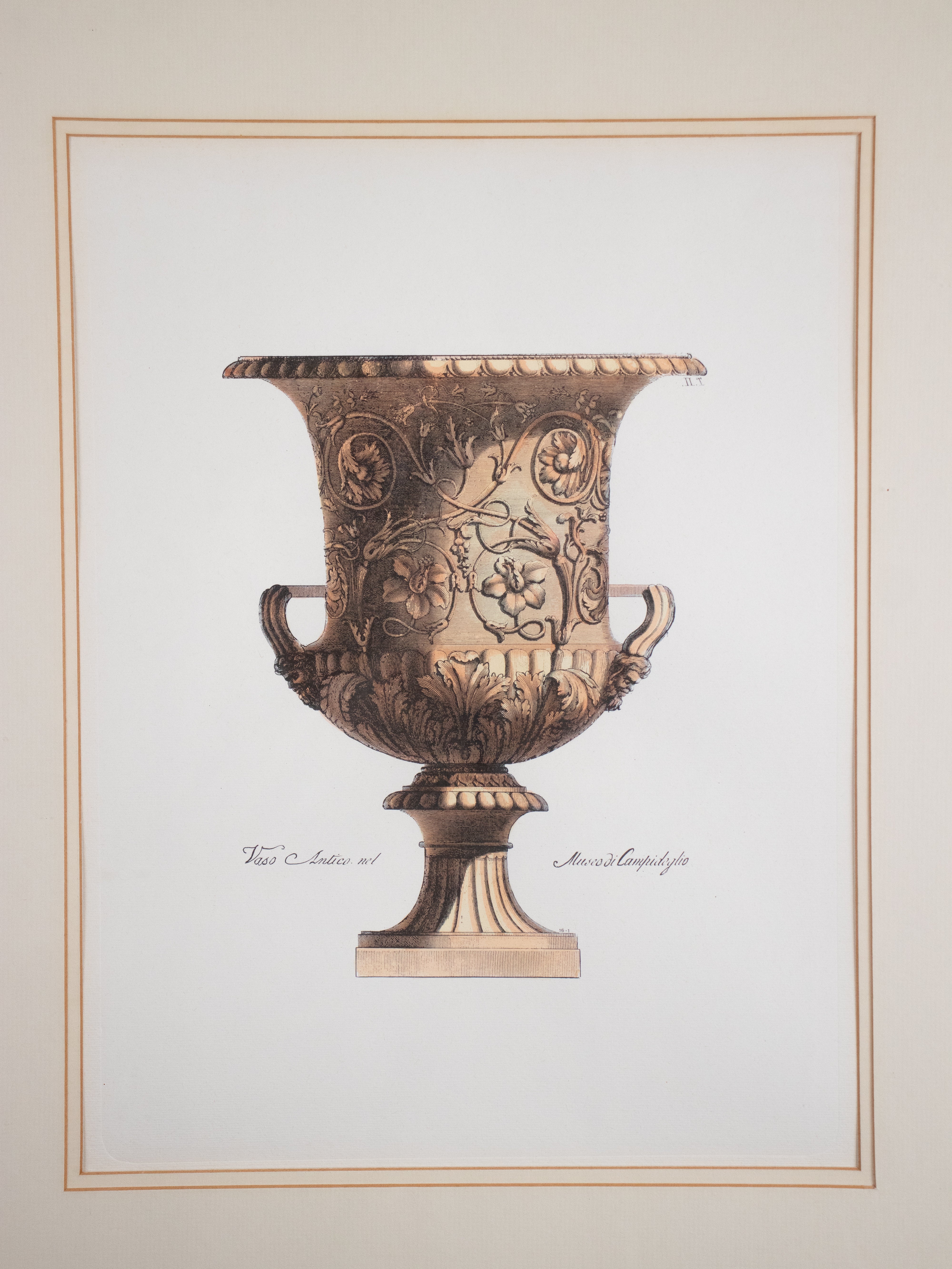 Description: This is one of three large framed etchings featuring classical urns in the style of Giovanni Battista Piranesi. Each of the three prints depicts a Vaso Antico and inscriptions noting the collection. Preserved in a solid wood frame with hanging mechanism attached.