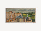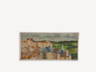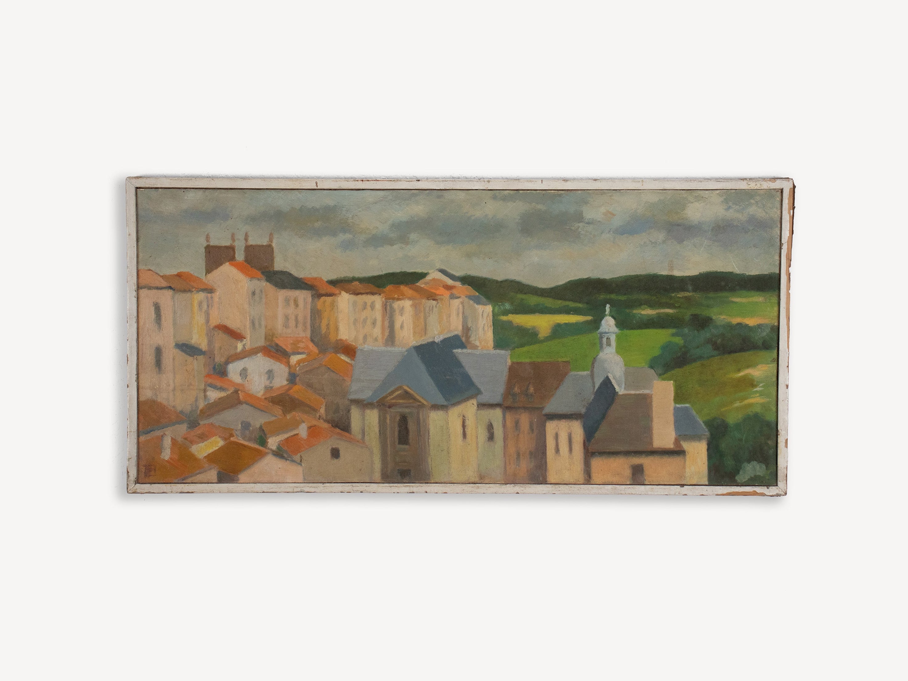 Description: Mid Century Landscape Oil Painting depicting a charming village in the north of France. The palette captures subtle shades of terracotta, greens and blues. Oil painting on board is In what appears to be the original wooden frame.