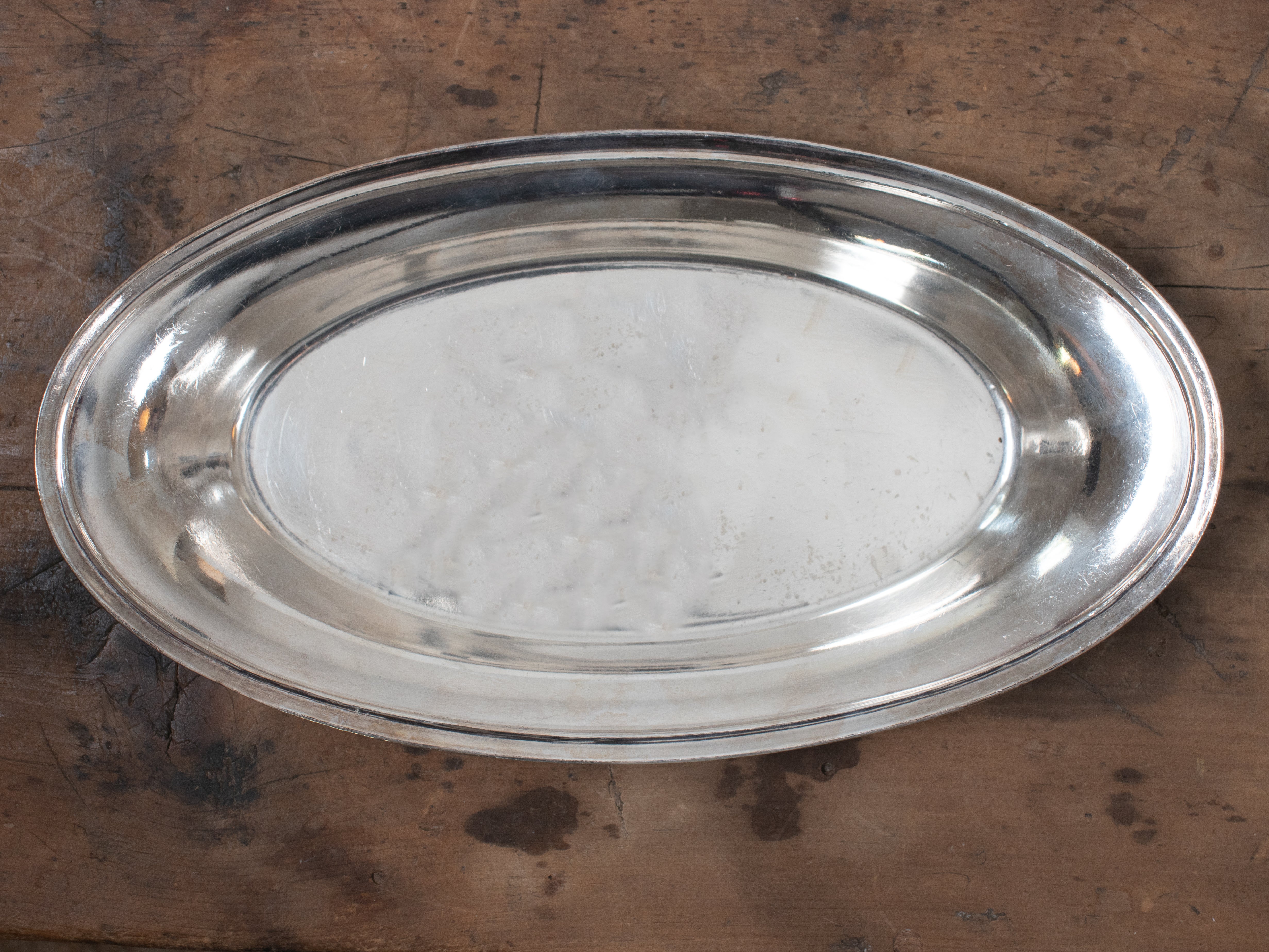 Description: International Silver Company hotel silverplated oval tray with simple rim detail. Stamped on the underside.