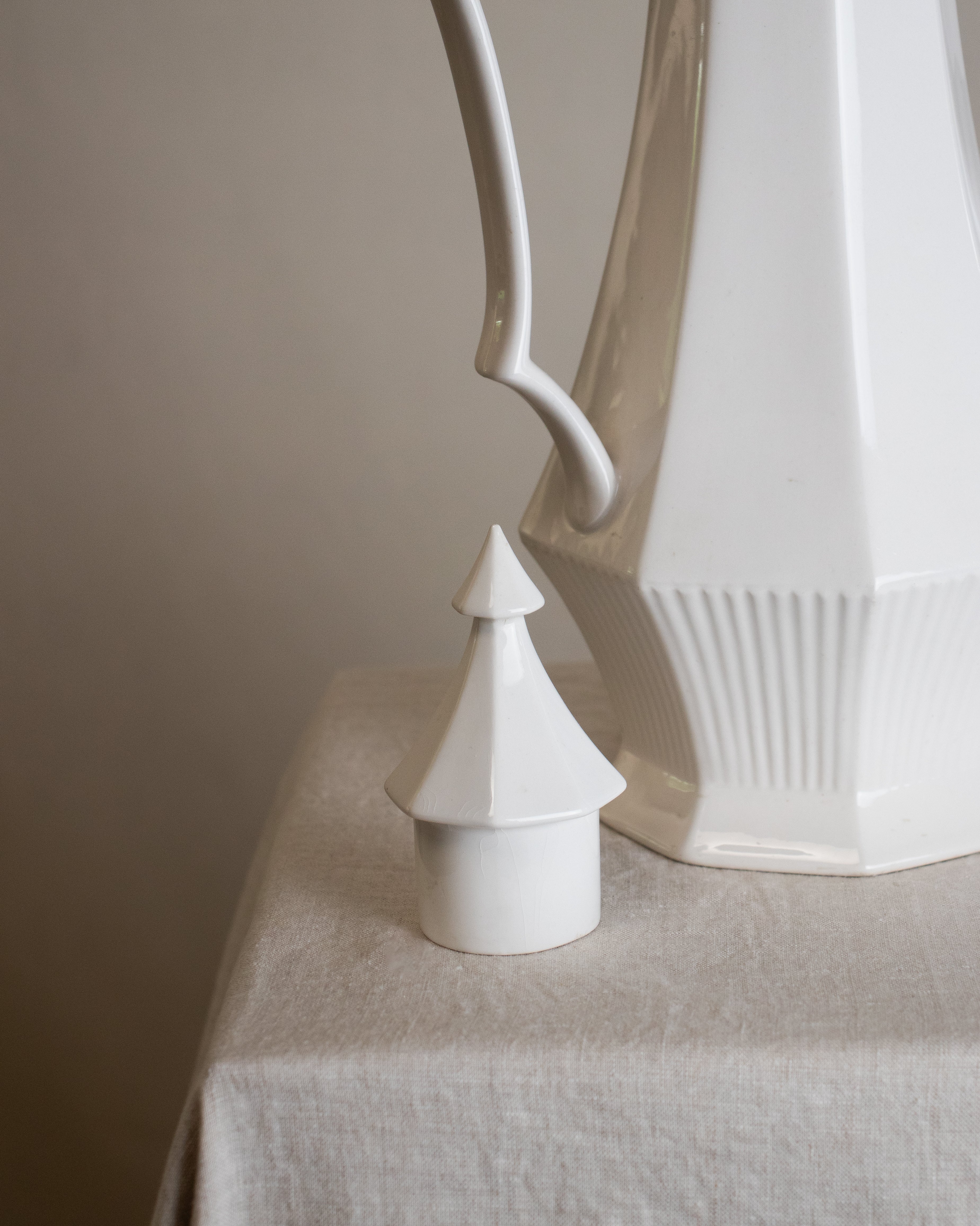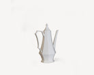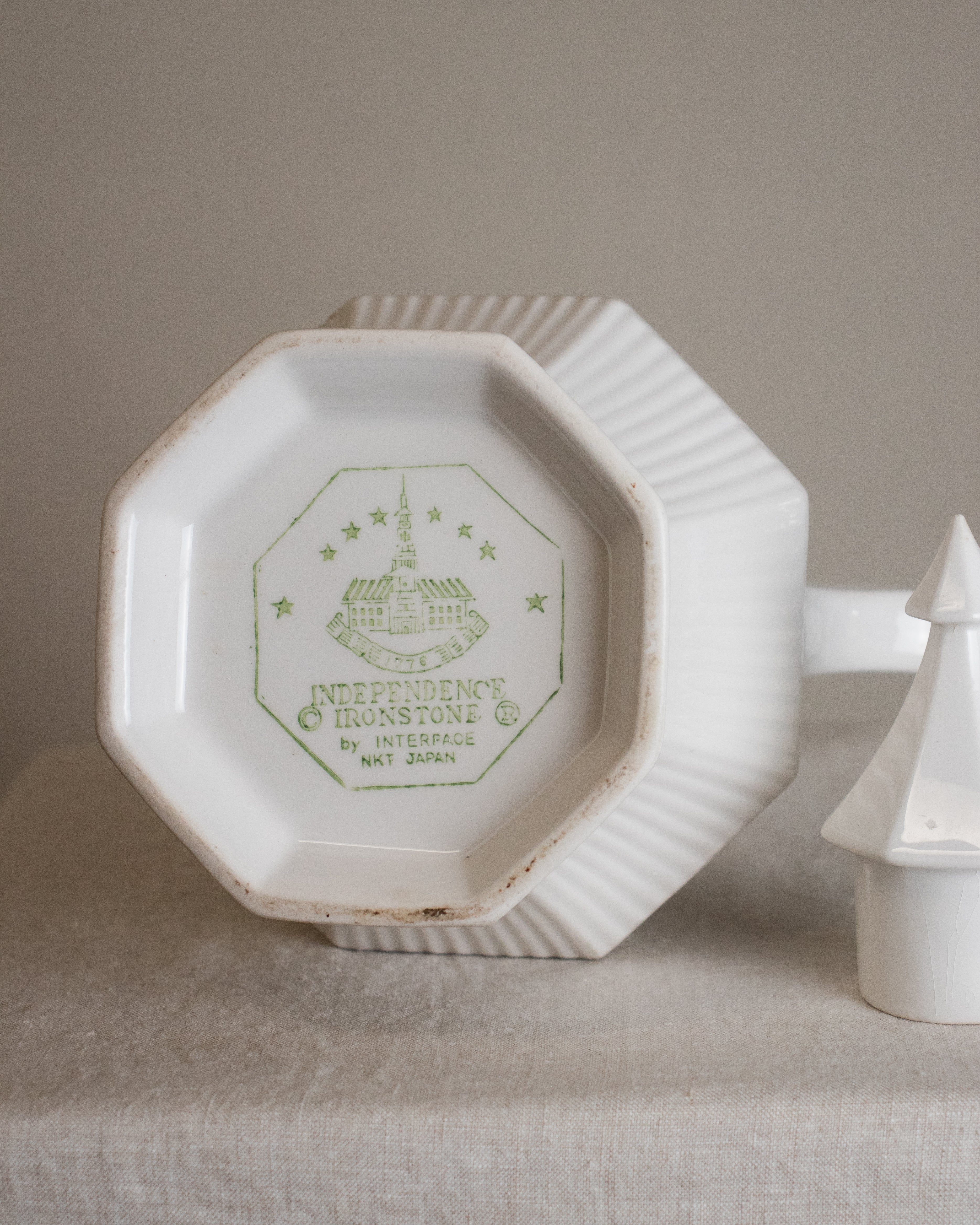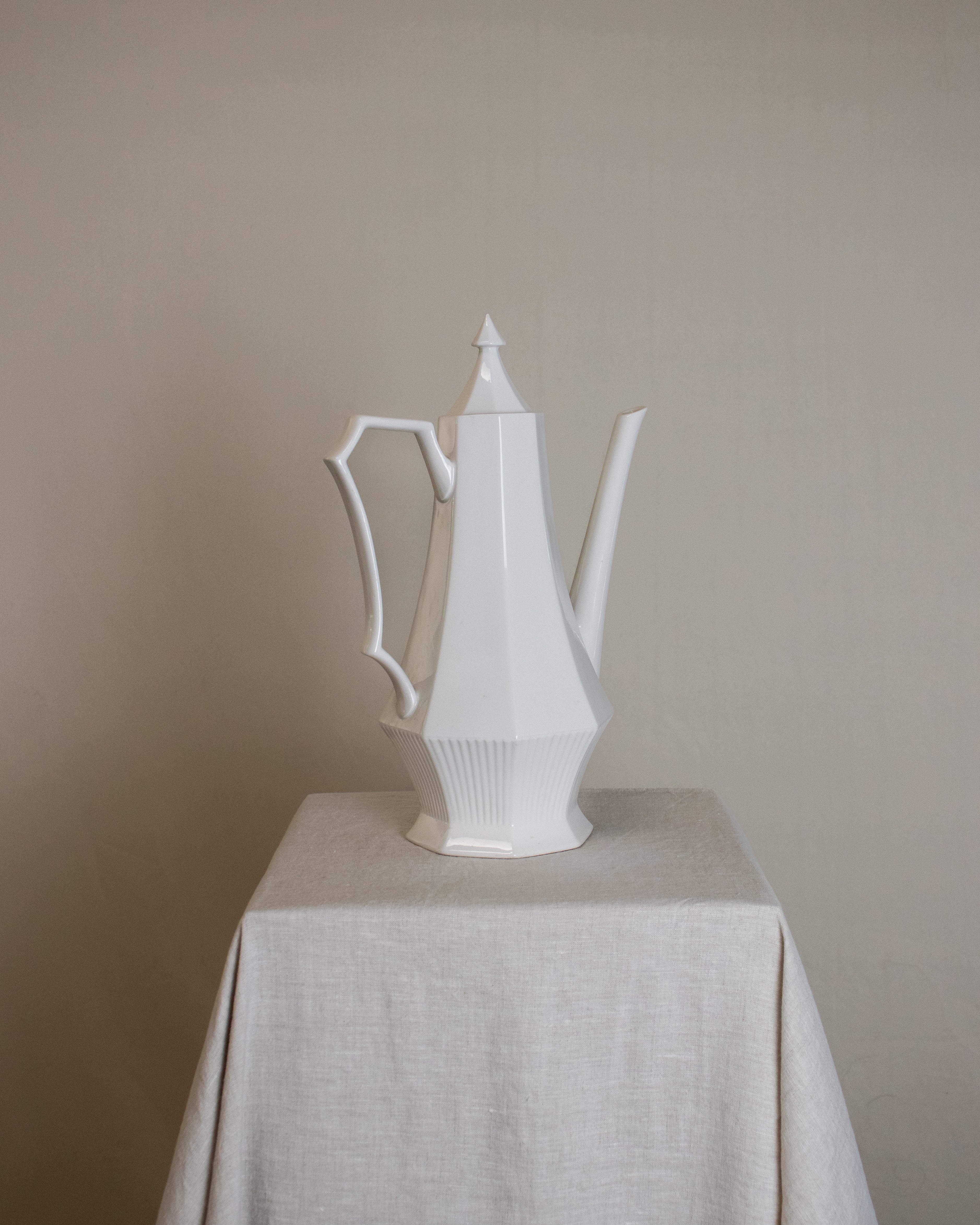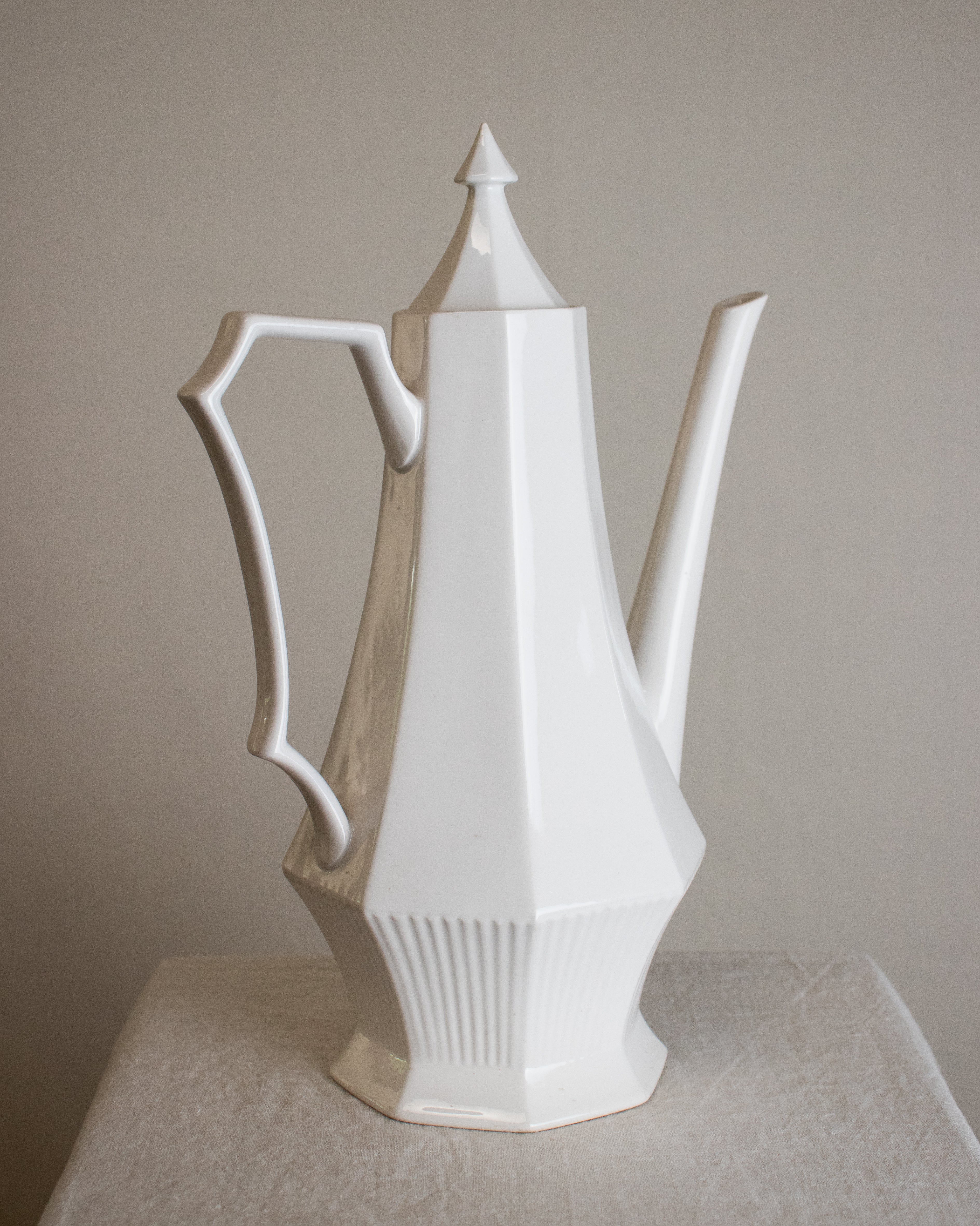 Description: Tall white porcelain coffee pot by Independence ironstone in excellent condition. Made in Japan, circa 1950s. Elegant handle with neoclassical shape and form.