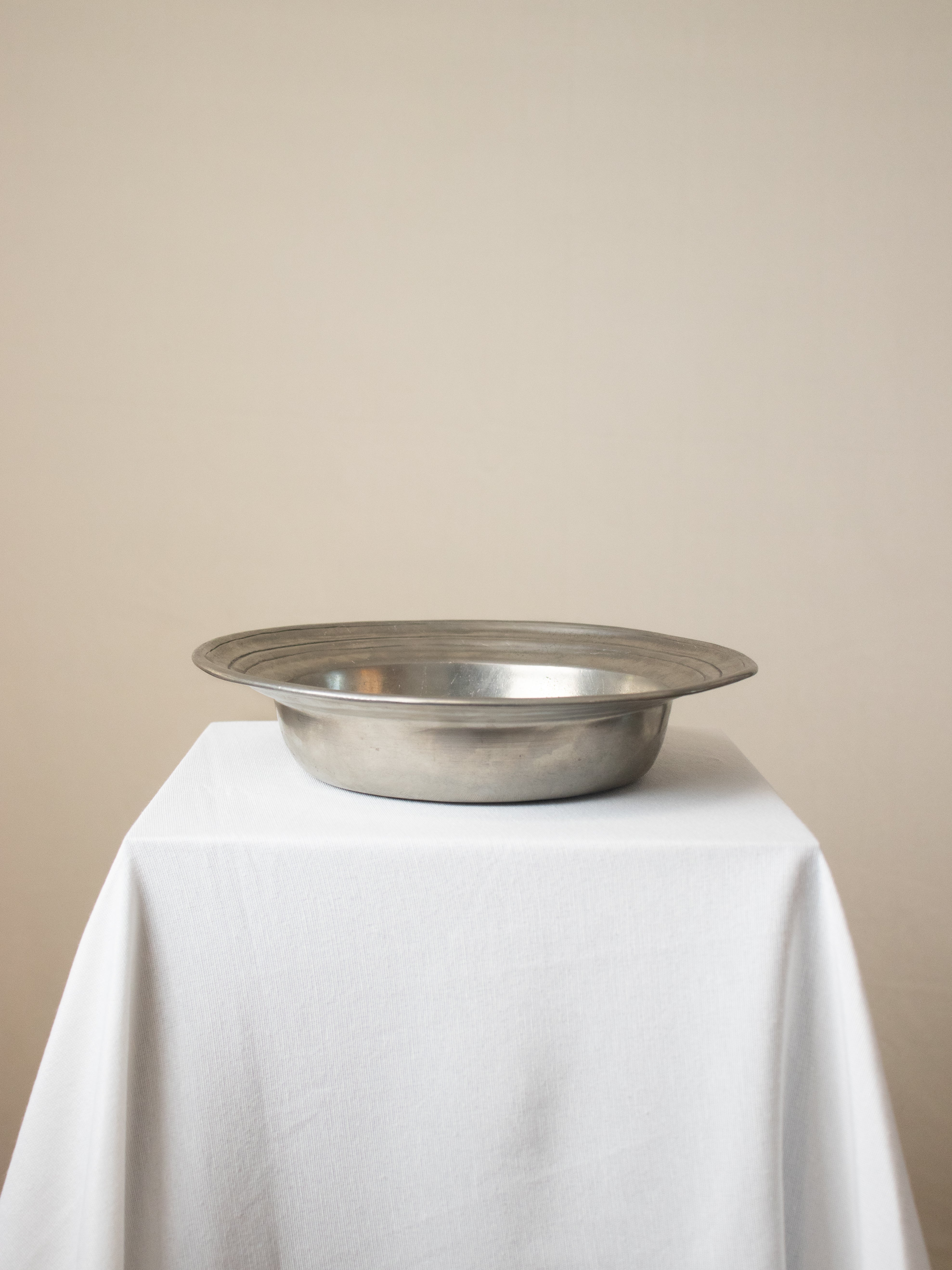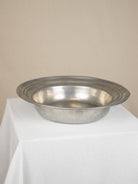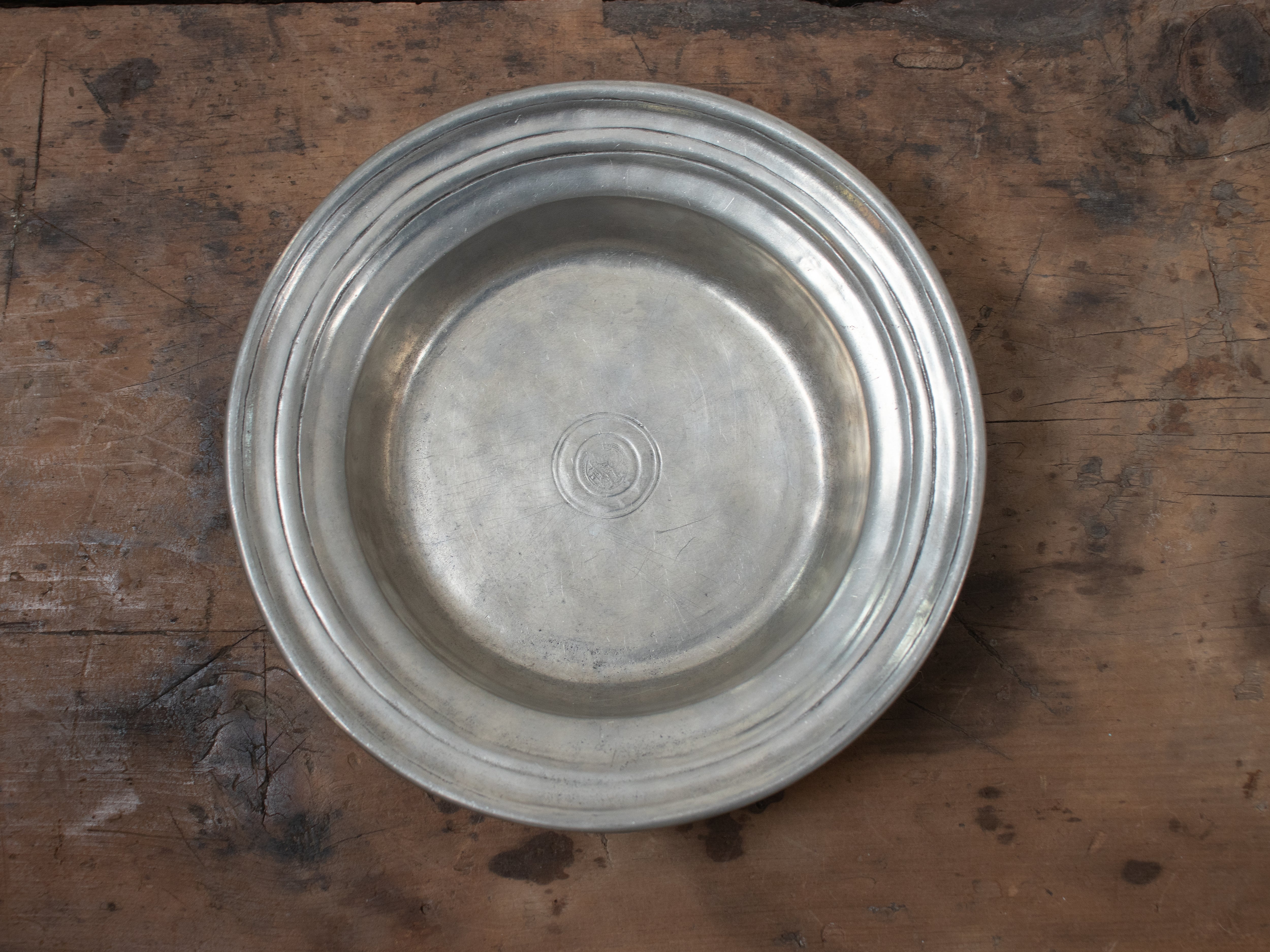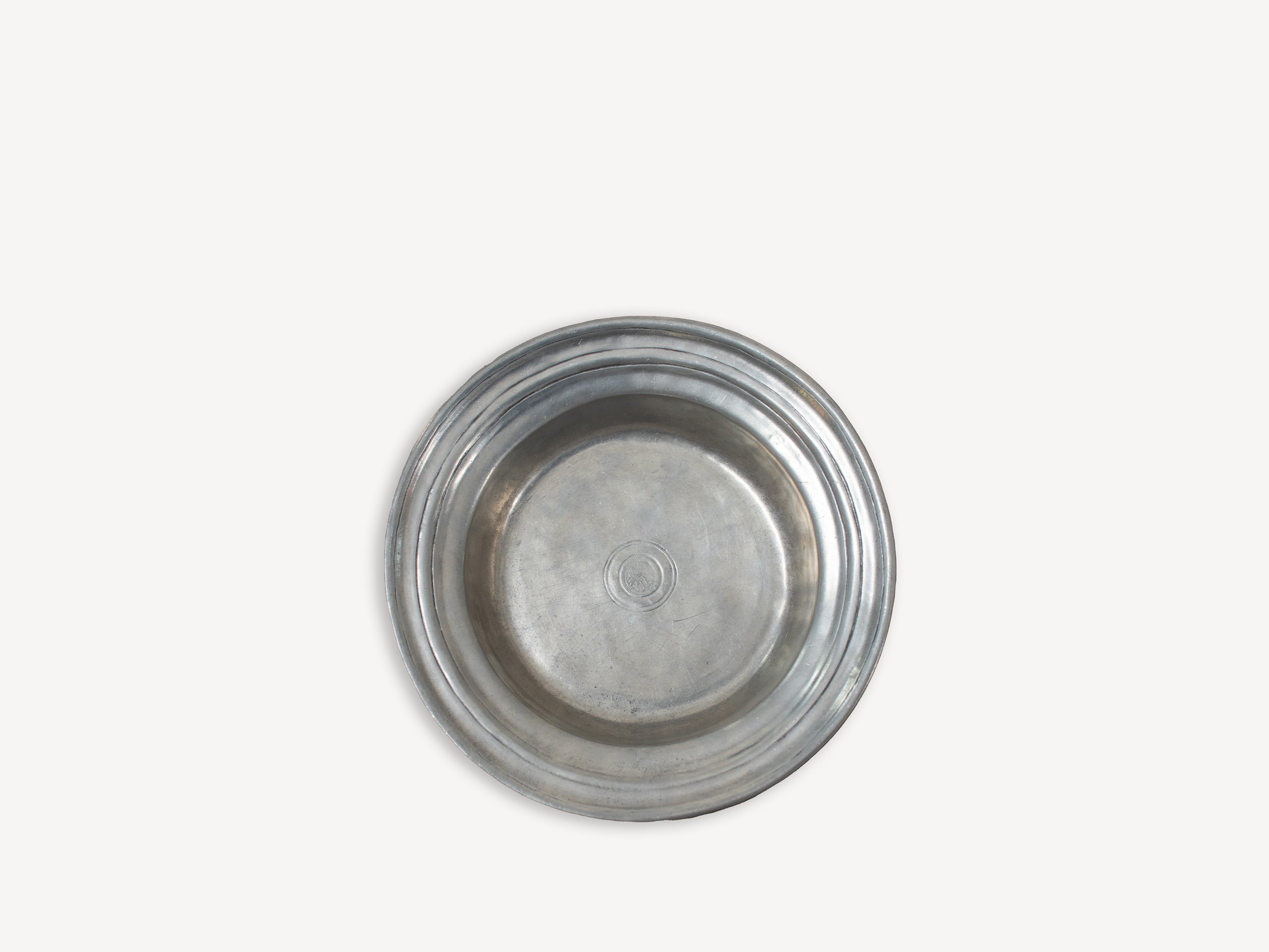 Description: Cosa Tabellini 95 pewter bowl with a wide, incised rim and a circular hallmark impression in the center. The underside is stamped with the makers hallmark.