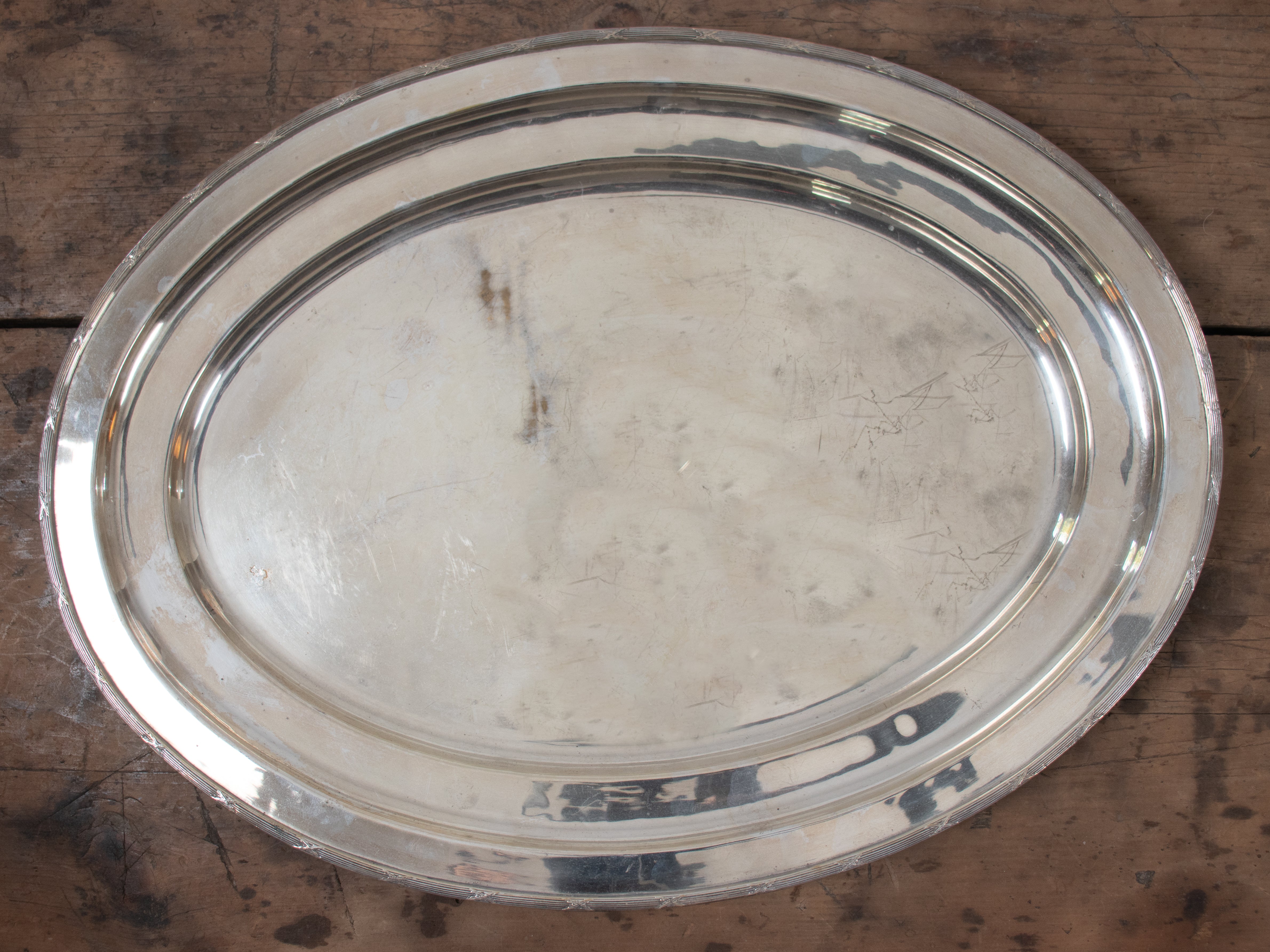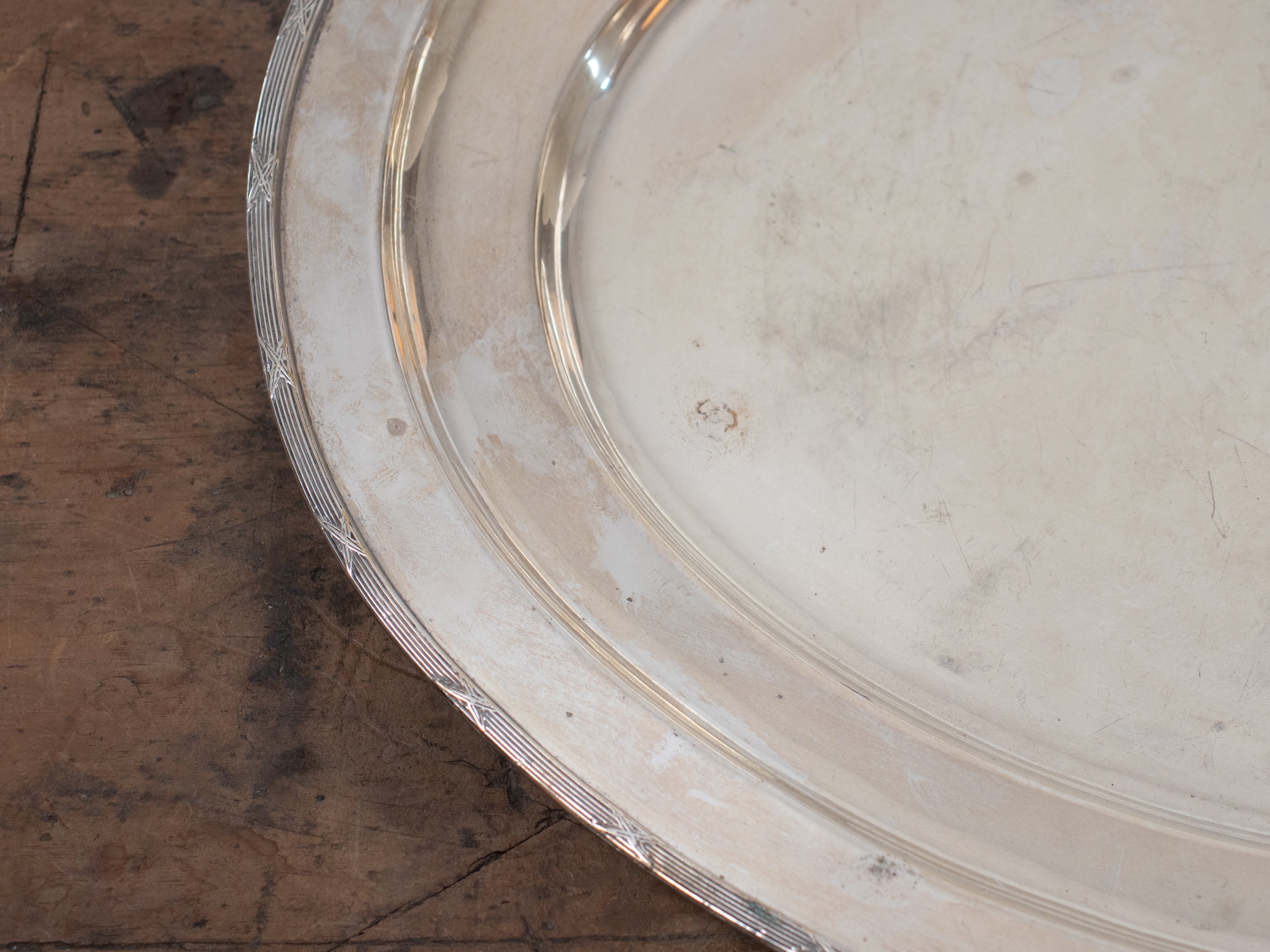 Description: Extra Large and sturdy hotel silver-plated tray with decorative, reeded border and star-like motifs. This piece shows signs of wear including scratches and discoloration to the surface.