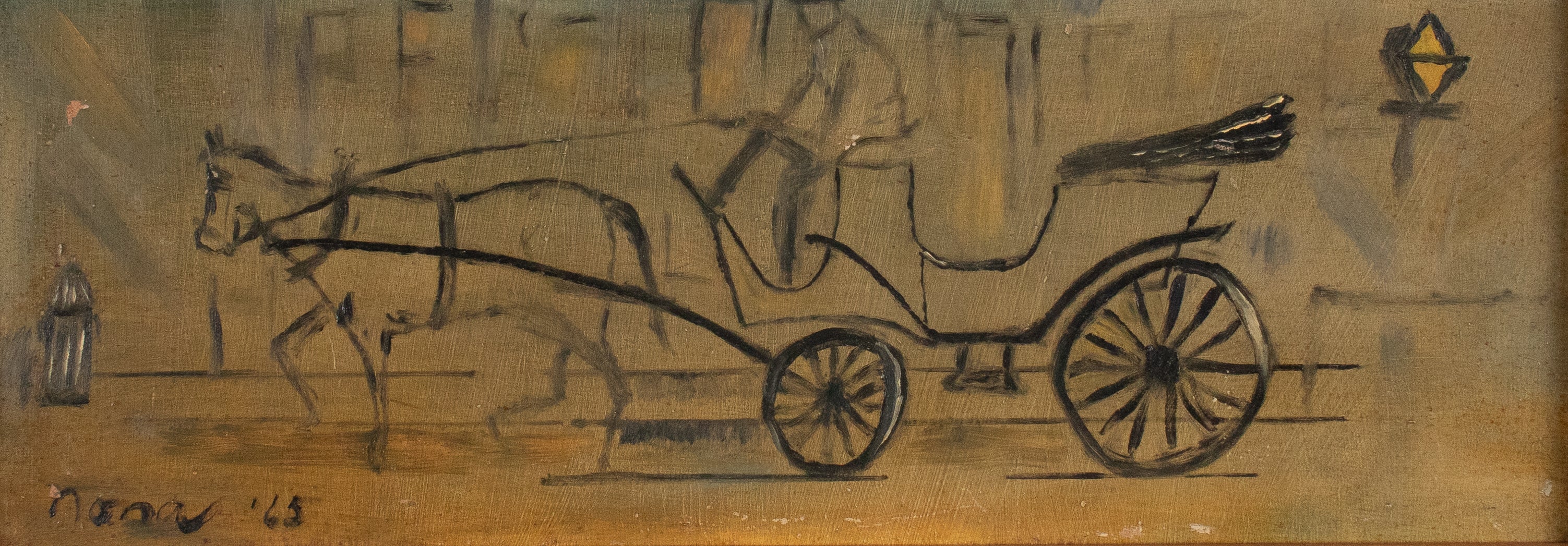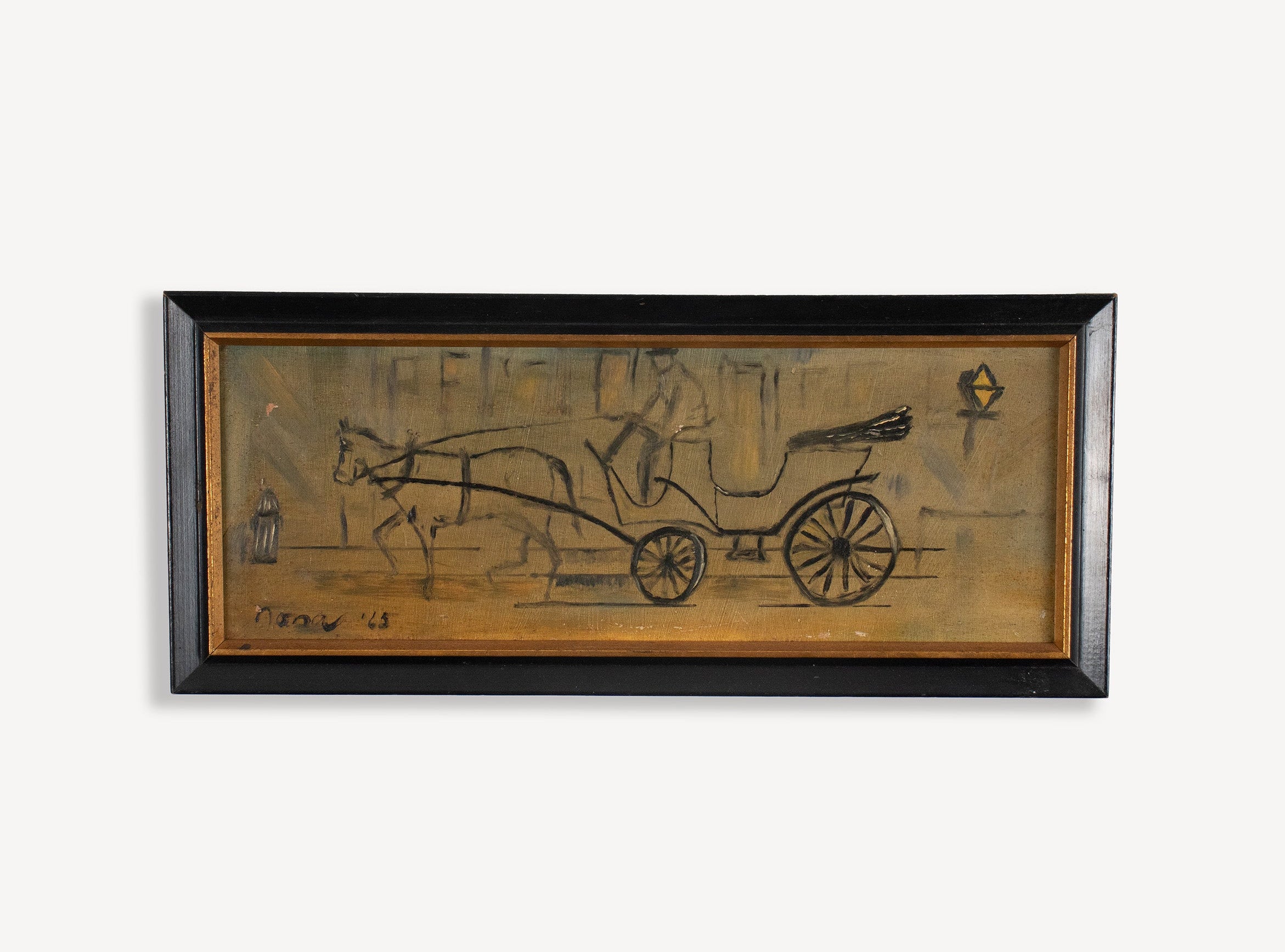 Description: Authentic Mid Century Painting depicting a horse and carriage. Wooden black frame with gold detailing. Signed and dated lower left corner.