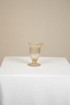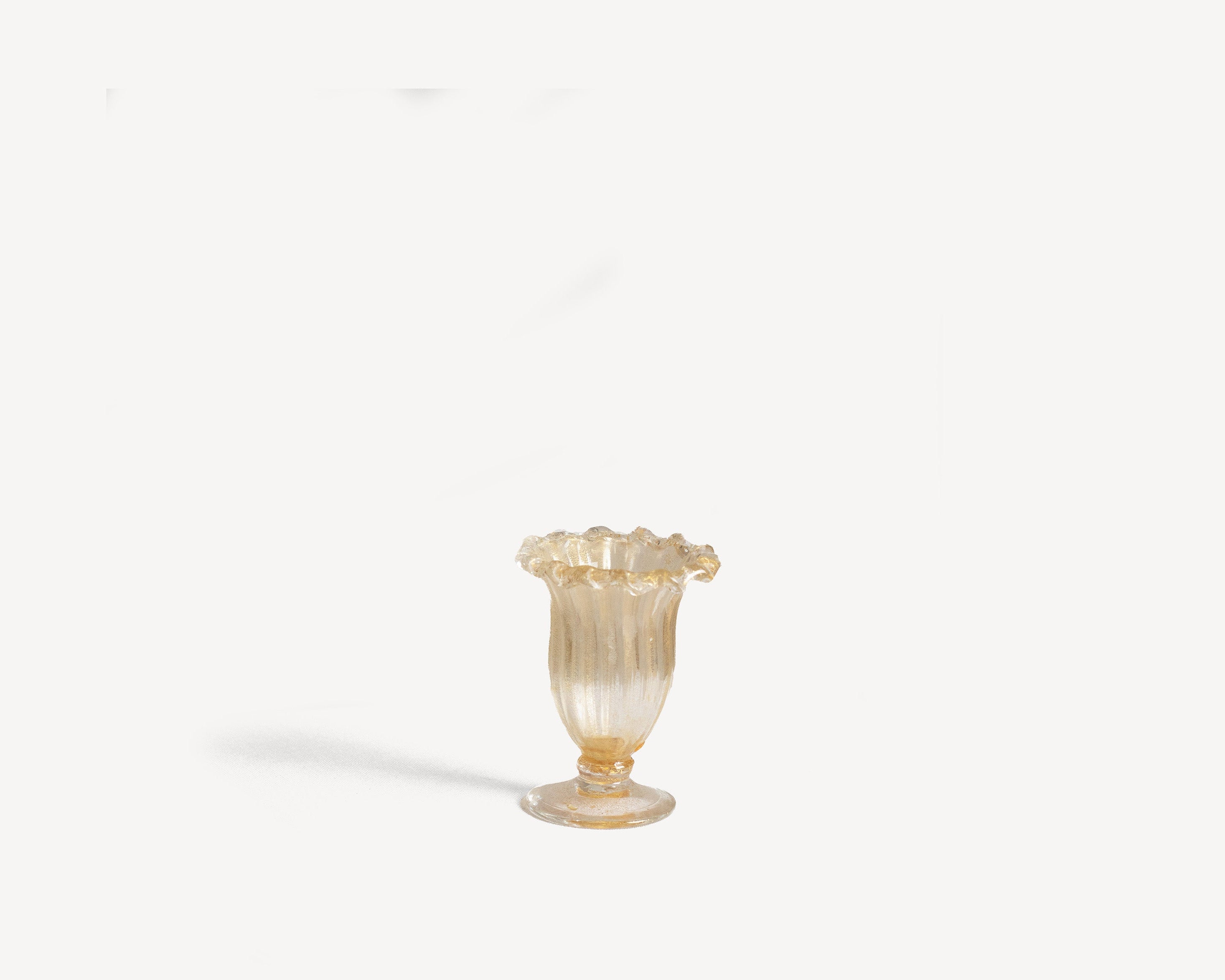 Description: Vintage Murano-Style Bud Vase adorned with a ruffled rim and avventurina gold flecks. These can also be used as a tasting glass or shooter. There are four available and are sold individually.