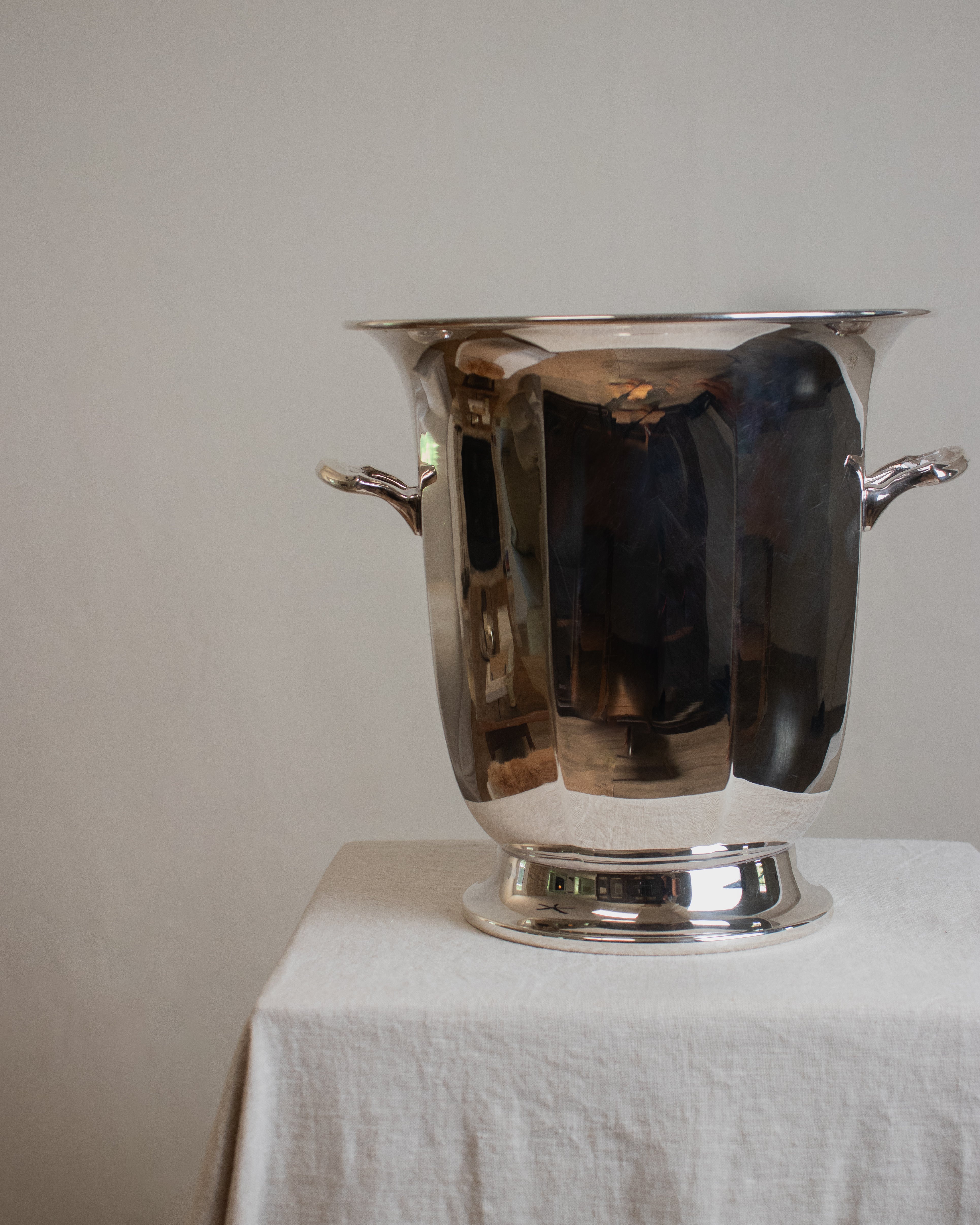 Description:  Silver Plated Champagne Bucket with handles by Wallace Silversmiths. Excellent Condition with minimal scratches and patina.