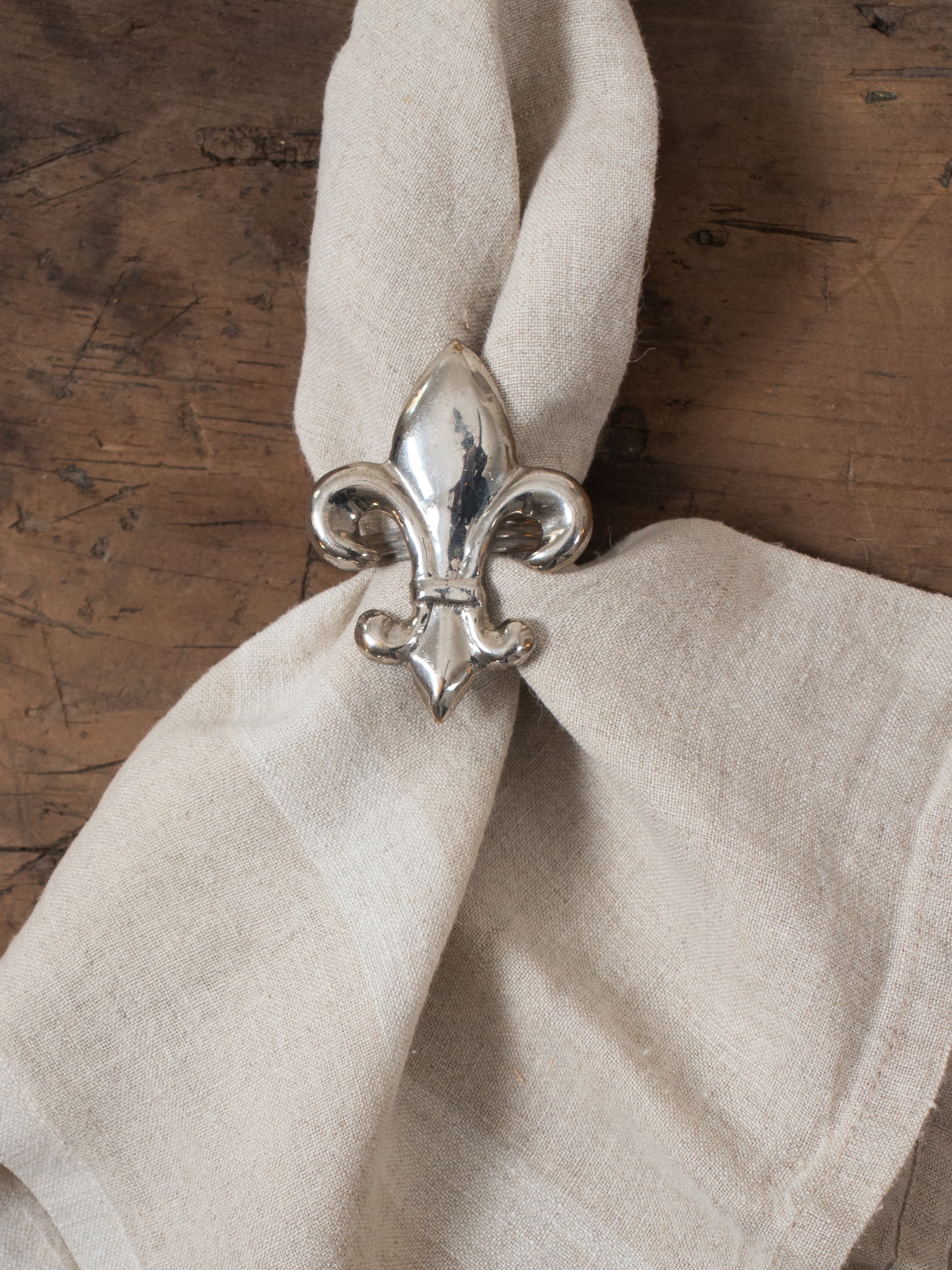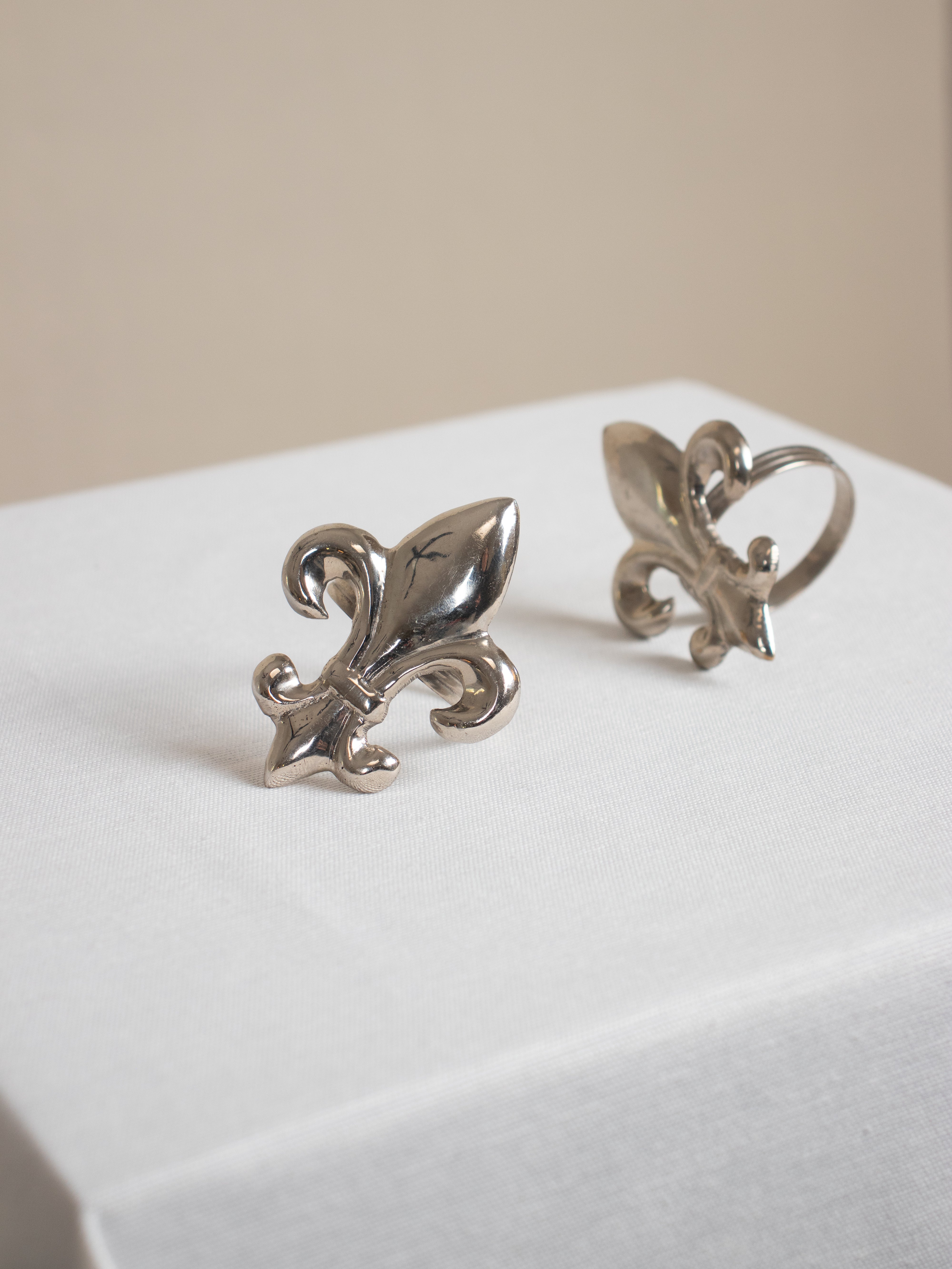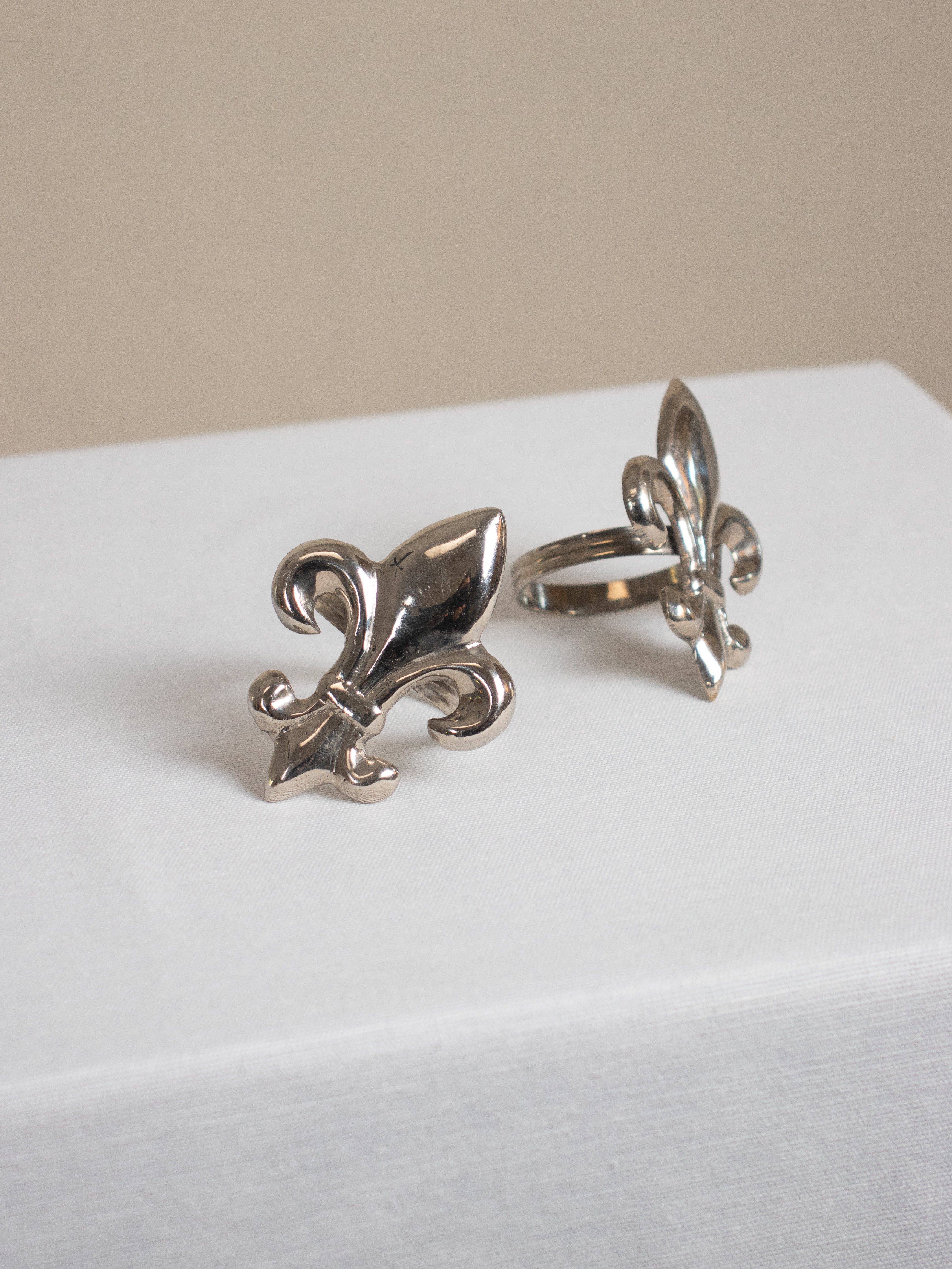 Description: Set of 8 vintage Fleur-de-Lis napkin rings perfect for a classic tablescape.